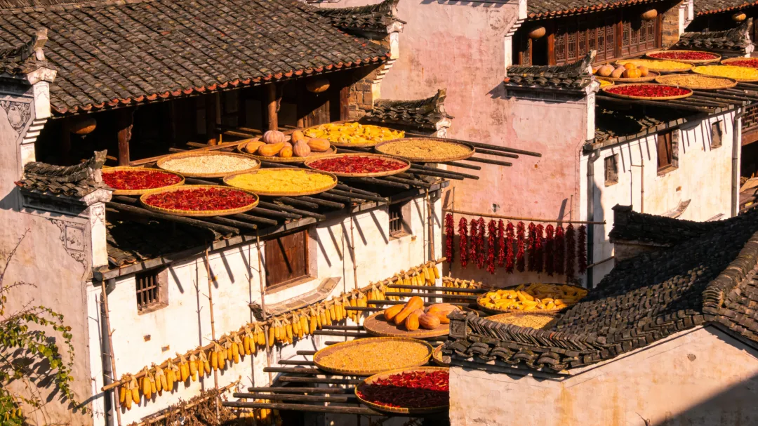 篁岭,是婺源的灵魂所在,也是 “晒秋” 文化的发源地。这座建在山崖上的古村,没有平地,村民们便将晒匾架在房前屋后的木架上,每到秋季,红的辣椒、黄的玉米、橙的南瓜、紫的茄子,层层叠叠铺在晒匾中,与白墙黛瓦的徽派建筑相映成趣,构成一幅色彩斑斓的 “晒秋图”,成为婺源最标志性的景观。除了晒秋,篁岭的天街、花溪水街、玻璃栈道也各有特色,行走在天街的青石板路上,两旁是古色古香的商铺,飘着徽墨酥、酒糟鱼的香气,满满的人间烟火。
