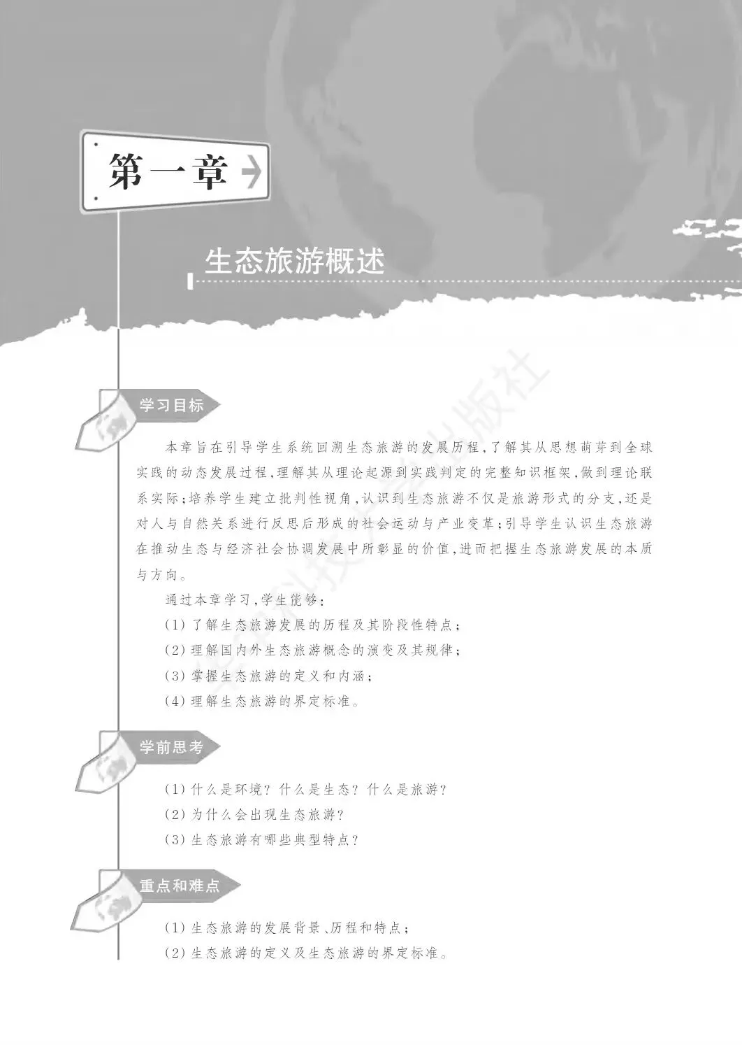 《生态旅游》教材以生态文明思想为指导,立足中国式现代化背景下人与自然和谐共生的战略需求,遵循“理论—资源—规划—系统—参与—业态—评估”的逻辑脉络,形成“基础认知(内涵、理论)—核心方法(资源评价、规划技术)—多元实践(社区参与、业态创新、成效评估)”的递进式知识结构。教材突破传统旅游学范畴,深度融入生态学(生态系统理论)、社会学(社区参与理论)及管理学(可持续发展评估)等核心内容,注重量化方法与实证依据,如旅游承载力评估模型等,强化生态旅游作为一门交叉学科的严谨性与前沿性。教材注重价值观引领,尤其注重将“人与自然和谐共生的现代化”理论思想与规划策略、社区协作机制等实践方案相融合,力求使学生深刻理解其在推动绿色发展、促进共同富裕、建设美丽中国中的时代使命。