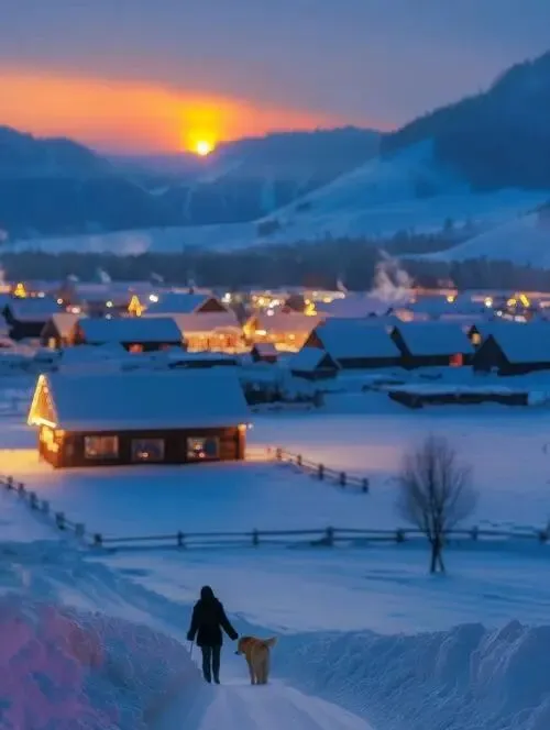 阿勒泰禾木看木屋与雪岭,日出一照屋顶冒金光,马蹄印像行书,走一圈脚都不想抬。