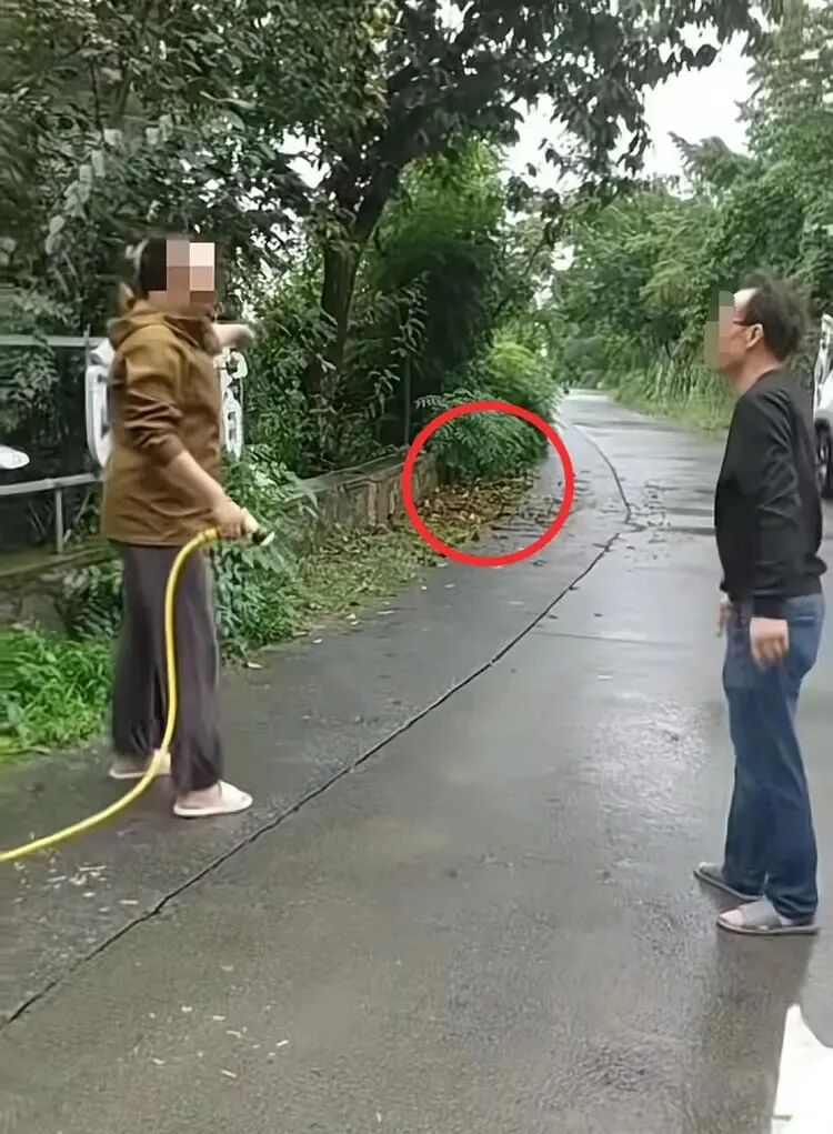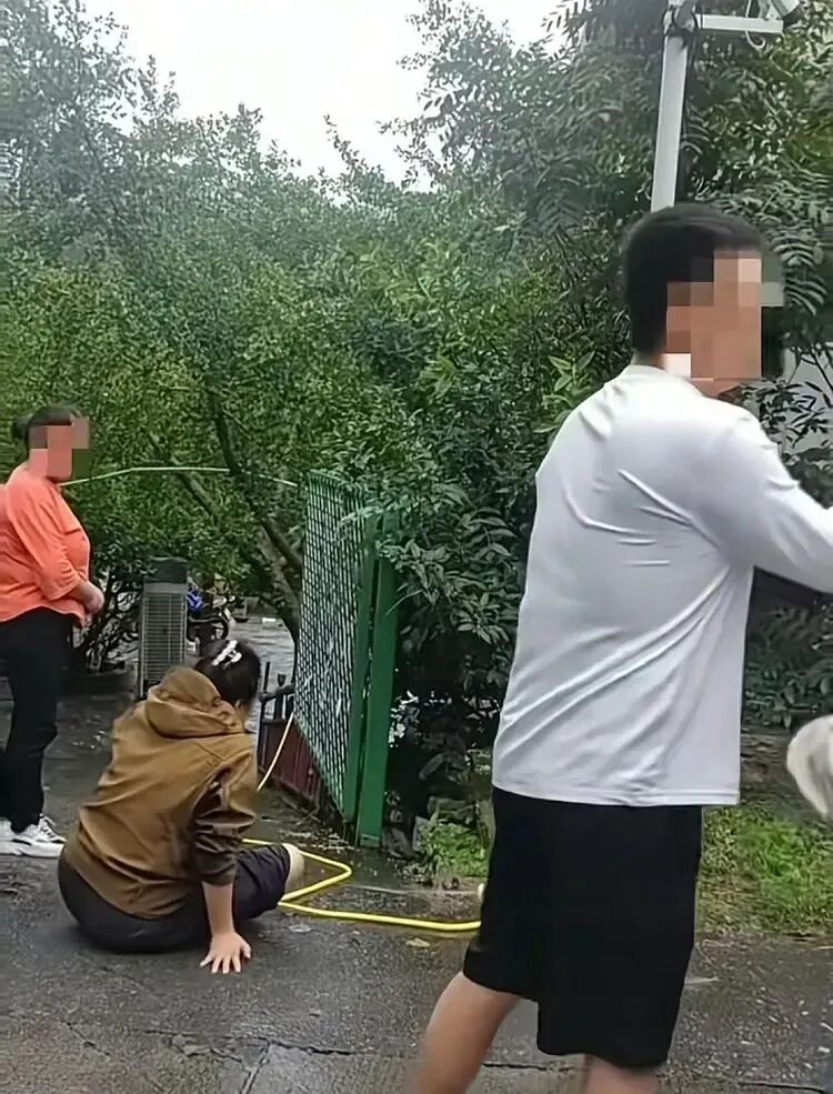 高压水枪水压很大,小贾母亲被喷得眼睛都睁不开,差点摔倒,并下意识地用手推了老板娘一下,结果老板娘愣了一秒,突然就坐地上了。