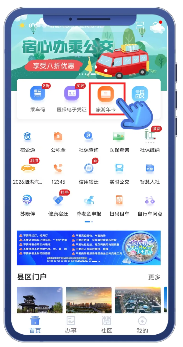 打开 宿心办APP,注册登录并完成实名认证,点击首页 【旅游年卡】 图标,即可进入年卡服务专区,自由选择购买👇