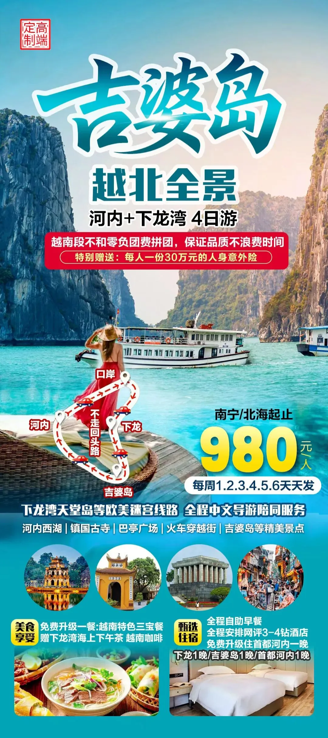 越南旅游 越北全景 越南下龙湾+吉婆岛+越南首都河内4日游四日游 图片排期 天天发团 980元/人