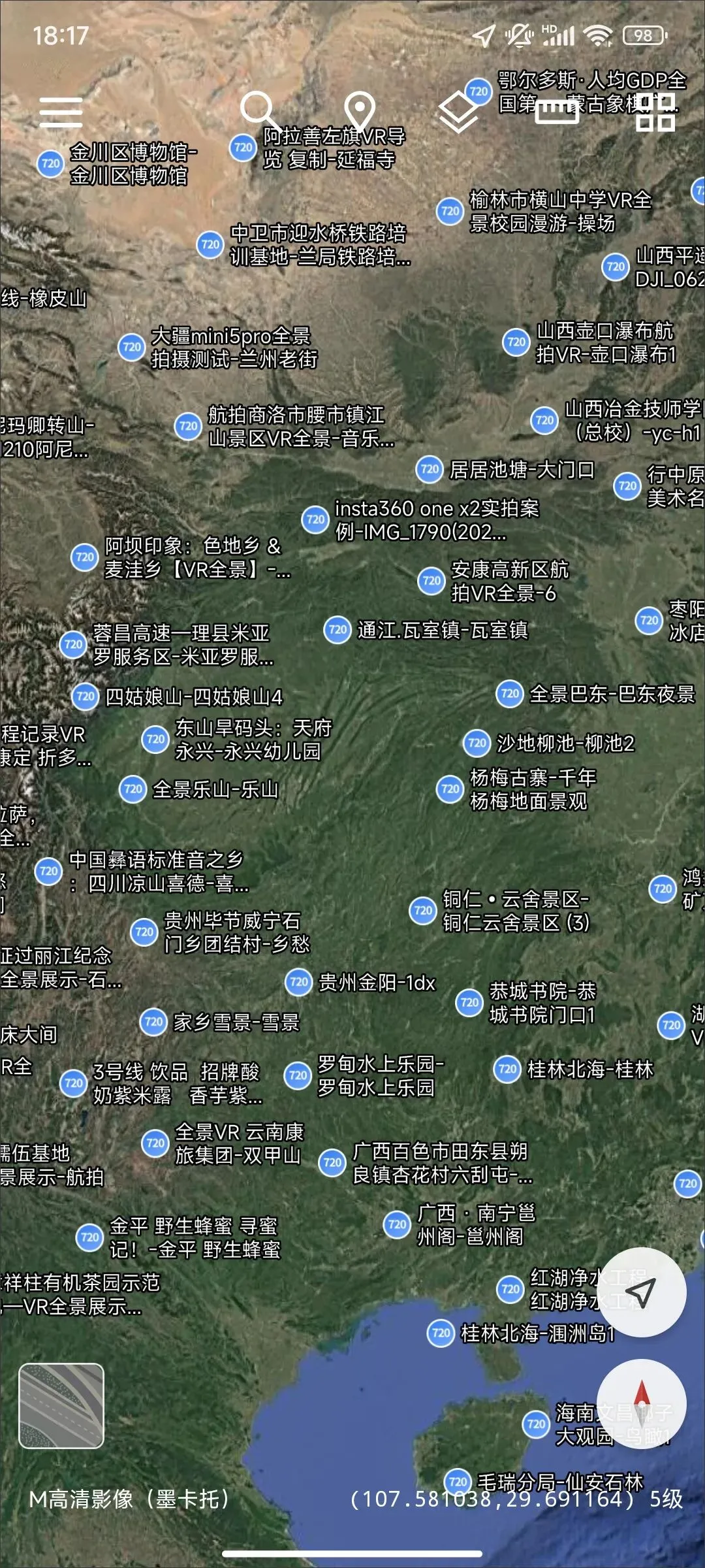 本次全景VR上线新增1700多个全景VR点,全部全景VR已达12516个景点,你可以在微图App中查看所有全景VR,如下图所示。