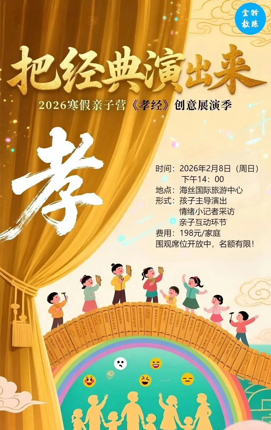 活动简介:这个寒假,欢迎加入《孝经》创意展演季。孩子们将用歌曲、舞蹈、辩论、情景剧等活泼形式,亲自演绎《孝经》内涵,更可化身小记者现场采访演员与嘉宾。这不仅是一次才艺展示,更是亲子共学、共创、共享的温暖体验,让传统智慧在互动中生动传承,点亮独特的新年记忆。