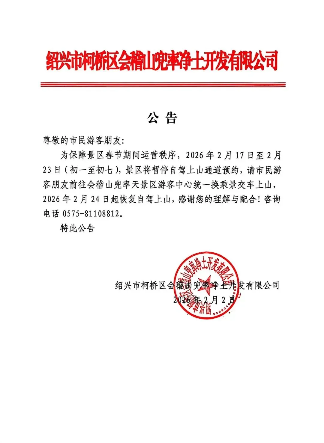 您现在的位置是:首页 > 国内旅游目的推荐 > 正文 国内旅游目的推荐 春节期间暂停!绍兴会稽山兜率天景区公告! admin2026年02月03日 14:41:06国内旅游目的推荐10 春节期间暂停!绍兴会稽山兜率天景区公告!点击上方蓝字爱越读 阅读绍兴 │ 每天有惊喜今天,绍兴会稽山兜率天景区发布公告,具体如下:尊敬的市民游客朋友:为保障景区春节期间运营秩序,2026年2月17日至2月23日(初一至初七),景区将暂停自驾上山通道预约,请市民游客朋友前往会稽山兜率天景区游客中心统一换乘景交车上山,2026年2月24日起恢复自驾上山,感谢您的理解与配合!咨询电话0575-81108812。特此公告绍兴市柯桥区会稽山兜率净土开发有限公司2026年2月2日#绍兴#绍兴兜率天宫景区#绍兴春节景区来源:兜率天景区服务公众号(本号转让,有意者加微信ylsyouwo联系,注明来意) 转载请说明来源于"旅荐网",部分内容转载自网络,如有侵权请联系qlwl@foxmail.com删除 本文地址:https://www.15386.cn/post/92626.html 上一篇 反向旅游太爽了,一座被严重低估的川西小城 下一篇 国庆反向旅游人少景美还省钱! 相关文章 茂名旅游年卡带你去遛娃!2026 遛娃指南就看这一篇! 老年旅游权益保障指南——宝慧律师所余心沅律师参加佛山电视台热点面对面专题节目||宝慧媒体访谈 青海甘肃旅游小包团露营定制:个性化体验与行程规划解析 强推!清明出游指南:北京出发1-2天,这些宝藏地值得去 2026 洛阳赏花旅行攻略|牡丹花期全梳理 + 3 天路线,错过等一年 2025青岛清明出游指南:赏花、优惠、安全提示 新疆 伊犁花海七天六晚行程安排(伊宁、赛里木湖、精伊牧道、伊塞牧道、恰库牧道、萨哈野果林、吉尔格朗河) 山东省线上参团旅游 “避坑” 指南 核心解读|新版《旅游规划通则》核心要点与行业影响 龙城区4月招聘活动行程安排 发表评论 取消回复 评论列表 这篇文章还没有收到评论,赶紧来抢沙发吧~