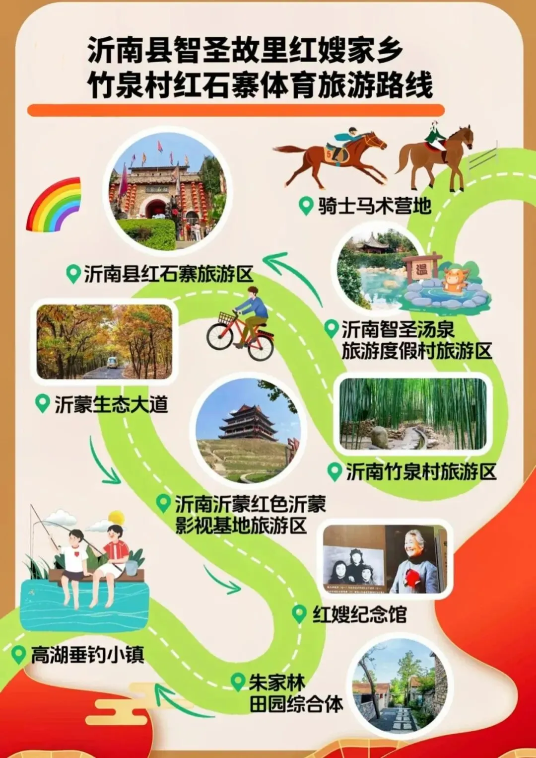 近年来,沂南县认真贯彻落实国家、省、市关于体育产业工作的部署和要求,做好“体育+”文章,推动体育与体育制造业、体育旅游、健身休闲等新兴业态融合发展,打造了朱家林户外休闲运动基地、化氏垂钓“两园一基地”、山东映川骑士马术营地、高湖垂钓康养度假小镇等一批特色体育产业项目,实现体育产业与旅游深度融合发展,扩大体育用品和服务供给,让企业、人民群众共享体育产业发展成果,促进共同富裕。沂南县智圣故里红嫂家乡·竹泉村红石寨体育旅游路线串联起多处旅游景点,游客沿此旅游线路将感受体育旅游、红色旅游、乡村旅游、康养旅游等带来的不同体验,在这片红色热土上感悟“党群同心、军民情深、水乳交融、生死与共”的沂蒙精神,体验革命战争年代的军民鱼水深情。游客可以在美丽的竹泉乡村里赏花游玩、戏水纳凉、户外露营、休闲采摘,住精品民宿,逛文创社区,体验诗意栖居的乡村生活;可以在沿途乡村观赏漫山春色;还可以在温泉水打造的水上乐园内体验温泉漂流、汤泉沐浴……骑士马术营地→沂南智圣汤泉旅游度假村旅游区→沂南竹泉村旅游区→沂南县红石寨旅游区→沂蒙生态大道→沂南沂蒙红色沂蒙影视基地→红嫂纪念馆→朱家林田园综合体→高湖垂钓小镇