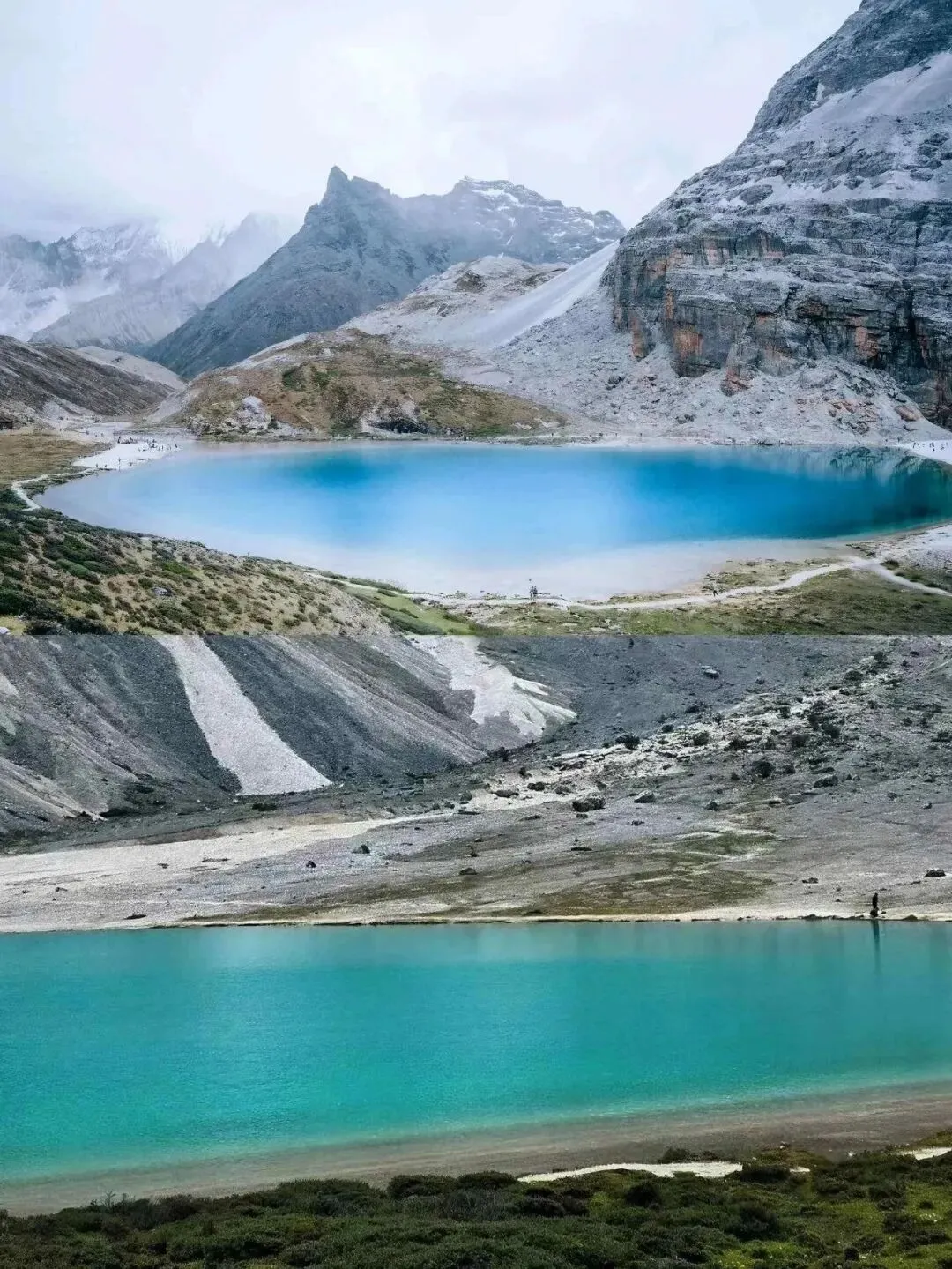 从.洛绒牛场往牛奶海走,海拔已经四千七。走.十步.就得.停下喘.,肺像个破风箱。但当你.看见那摊.奶白色的水,静.静躺在央迈.勇雪山脚.下,.边上绕着绛红.色的徒步者,所有骂娘的话都忘了.。.累是真累.,.美.也是.真美。