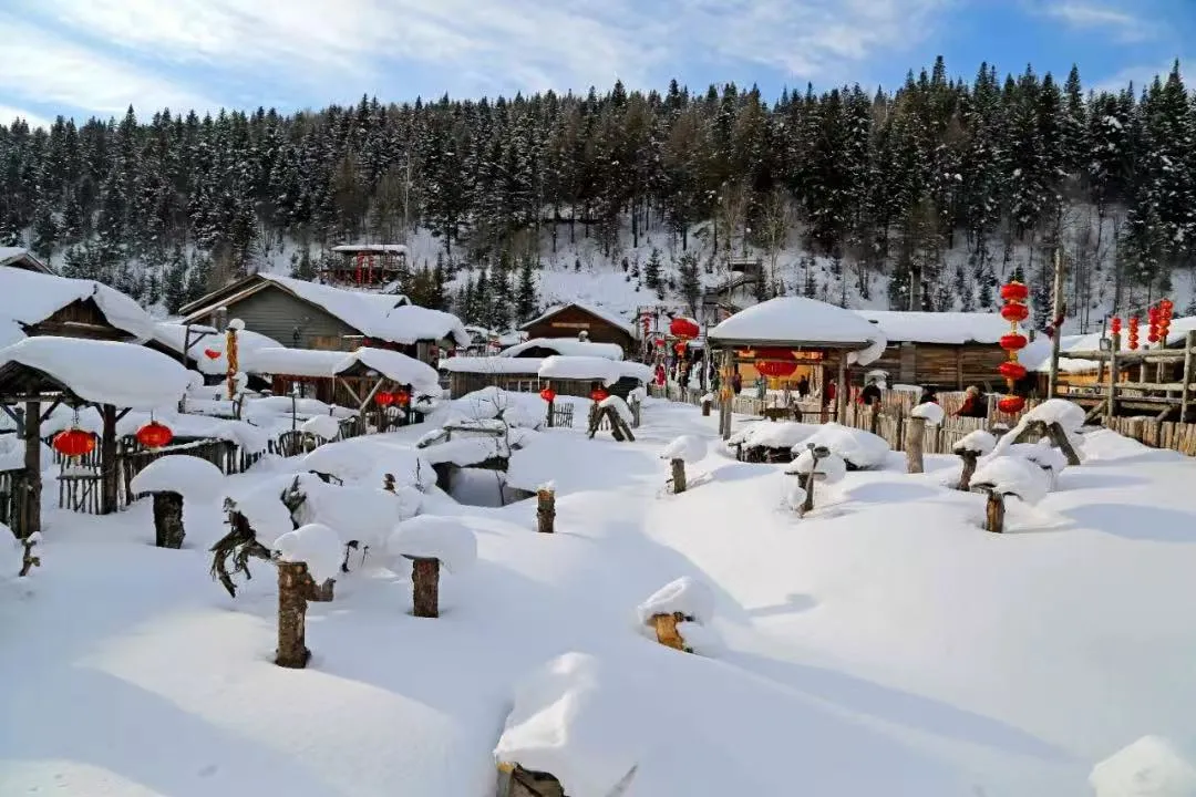 想感受东北冬日氛围,就来雪村!木屋屋顶堆着厚厚的雪,像一个个 “雪蘑菇”,红灯笼一挂,瞬间有那味儿了。晚上灯光一亮,暖黄色的光洒在雪上,还有炊烟袅袅,感觉自己在童话里。