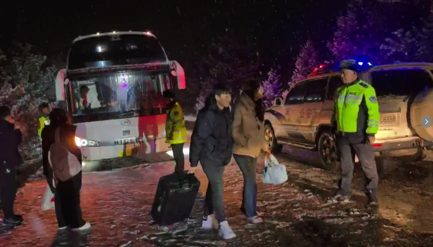 晚20时30分许,一辆载有54名游客的河北秦皇岛籍旅游大巴行驶在省道203线时三二岭路段时,驾驶员看着迎面而来的大雪和光滑的路面不敢再继续前行,原计划前往大同市住宿的行程被迫中断,游客们内心焦灼不已。