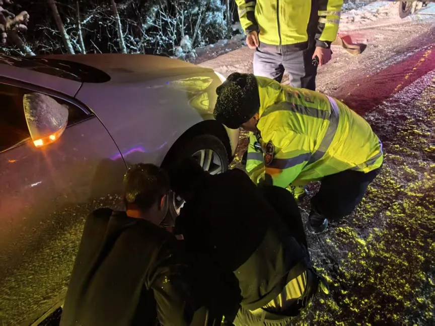 无独有偶,约21时30分许,六中队下达枝执勤组民辅警在国道336线抢风岭发辆了一辆满载乘客的大巴。经了解,该大巴车辆从大同前往灵丘,因降雪高速管制驶入国道。鉴于雪天路滑、能见度不佳,为确保乘客安全,民辅警果断采取“警车压速领航、全程护航随行”的保障方式,为大巴开辟安全通行通道。风雪中,警灯闪烁格外醒目,执勤民辅警凭借丰富的冰雪天气执勤经验,精准把控行车速度,实时通过喊话器提醒大巴司机保持安全车距、谨慎平稳驾驶。警车在前领航,大巴在后随行。22时17分许,执勤民辅警将该大巴车安全护送至浑灵交界。