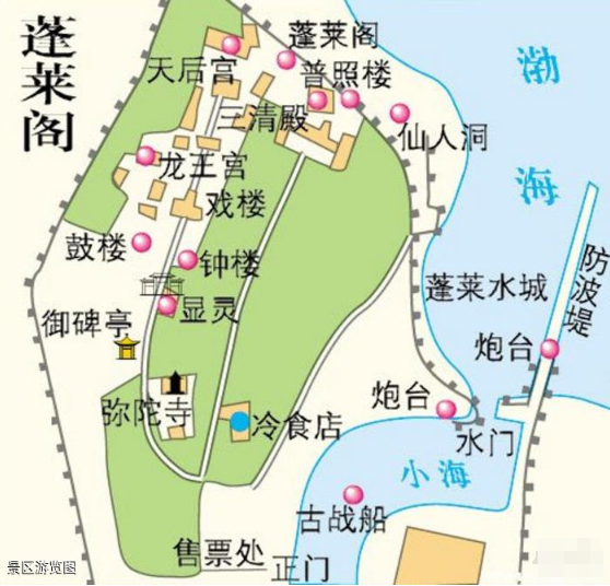 蓬莱阁旅游区包括三清殿、吕祖殿、苏公祠、天后宫、龙王宫、蓬莱阁、弥陀寺、白云宫、普照楼、宾日楼、卧碑亭、胡仙堂、子孙殿、仙人洞、观澜亭、澄碧轩、避风亭、感德碑亭等。