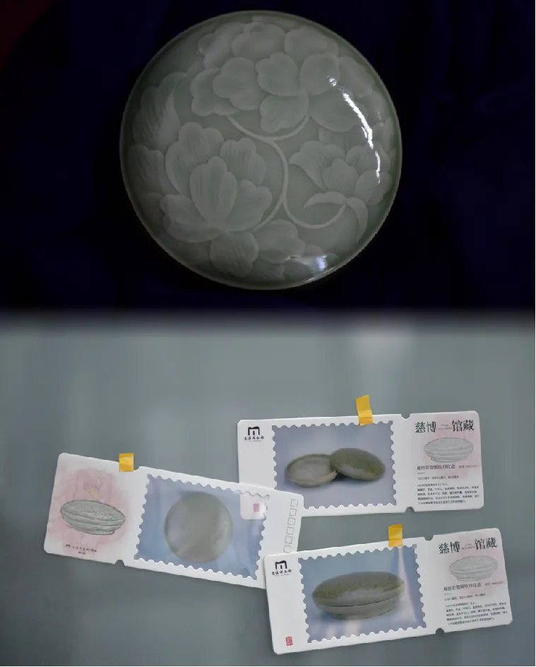 「北宋 越窑青瓷刻划牡丹纹」粉盒+胶片明信片