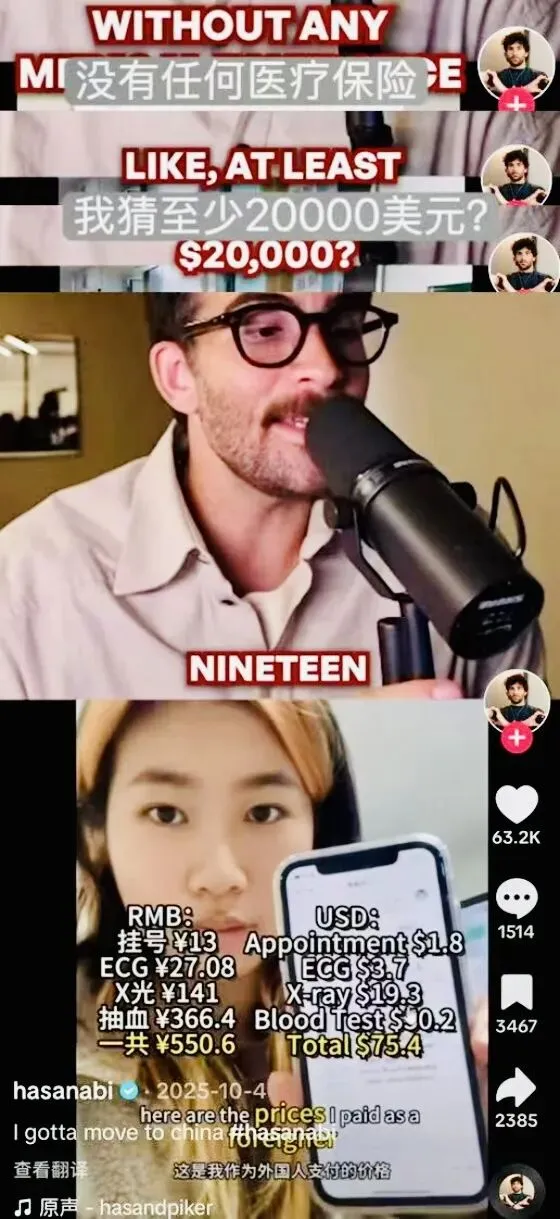 刷到个美国小哥举着张医院缴费单对着镜头喊:“19美元做X光!在美国够买三份快餐,这儿居然能看病!”