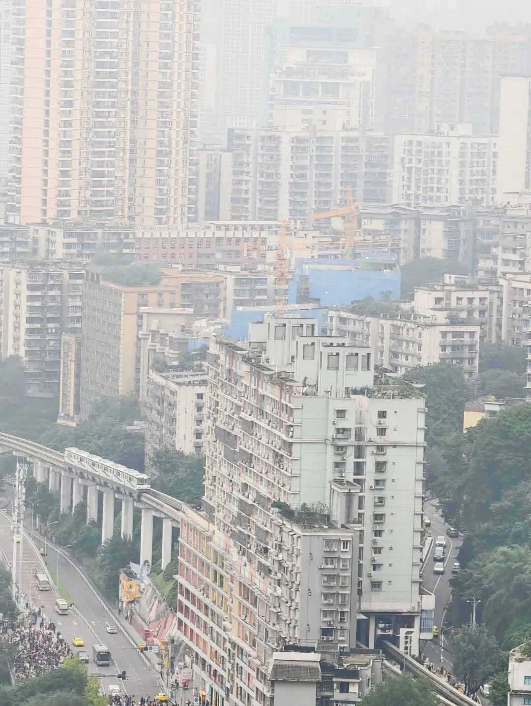 💡嗑点分析:这大概是全国独一份的奇幻视角——站在鹅岭栈桥上,你不再仰望或平视单轨列车,而是以一种罕见的俯瞰视角,见证单轨列车穿入居民楼的瞬间。
