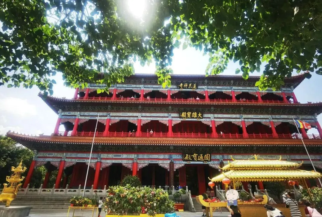 莲花山的望海观音距离山顶停车场并不远,大雄宝殿就在望海观音旁边,步行几分钟就到达。望海观音是目前世界上最高的箔金观音立像。