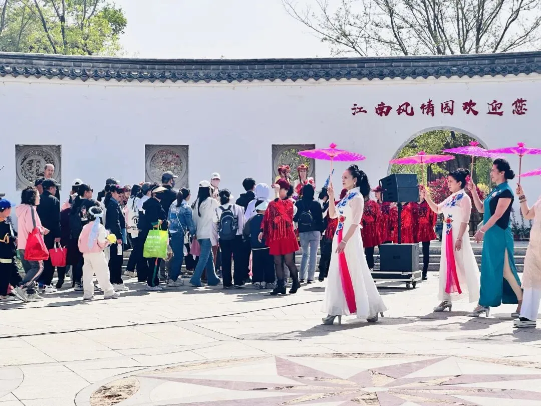 五一期间,江南风情园开展“以园林之名,赴花事之约,五一小长假玩出新花样”主题活动,游客可以看到不同颜色的三角梅、绣球花、杜娟花、玫瑰花、毛地黄、月季花、康乃馨、奥斯卡、小丽花等十余种特色花奔,再加上园区内种植的紫叶海棠、樱花、红花碧桃、二月兰、丁香花等多种木本花的开放,将园区妆点的千姿百态,分万妖尧。