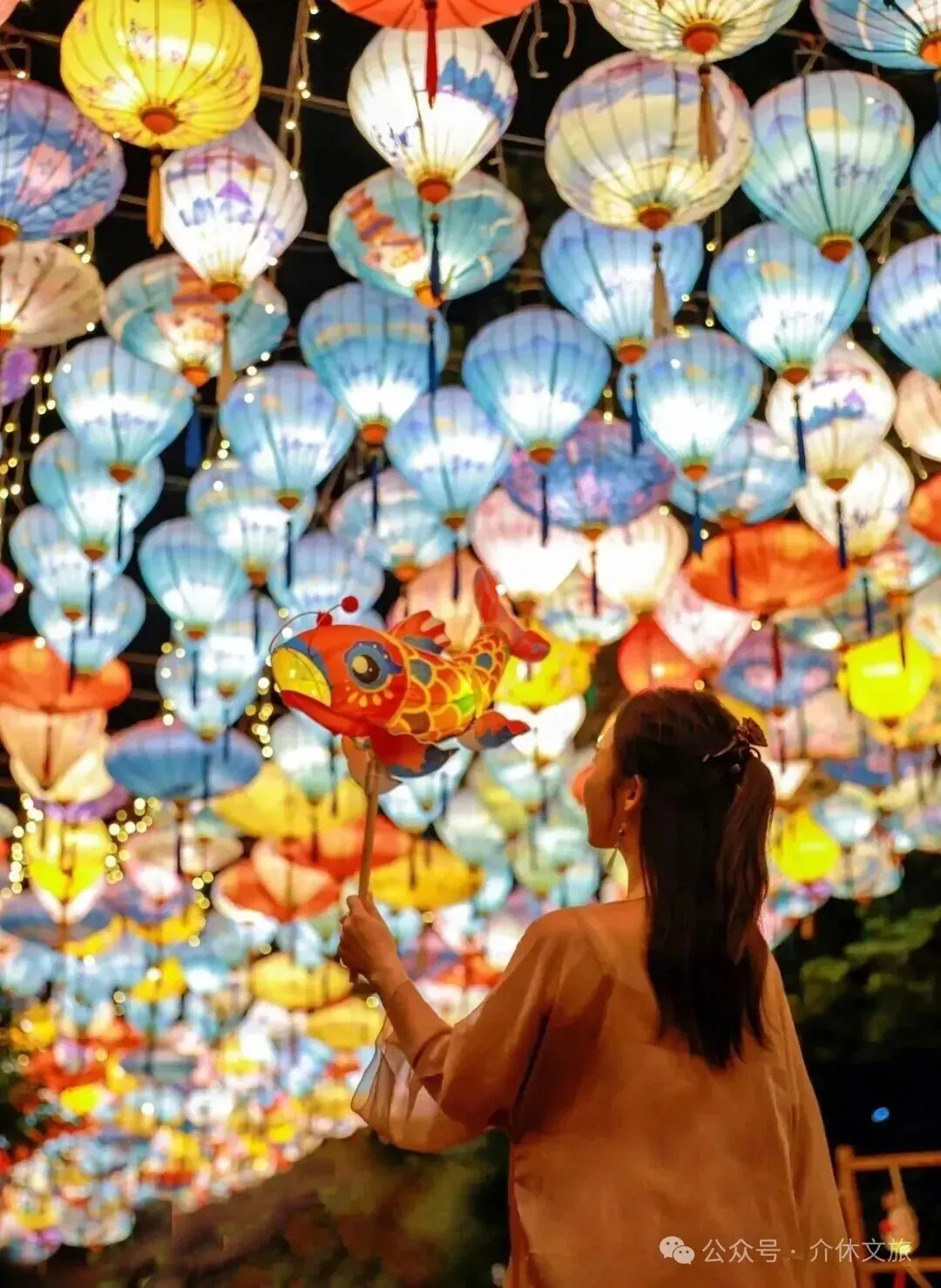 高颜值帅哥靓女佩戴面具手持鱼灯,沿主街向下,邀请游客参与互动,搭配国潮音乐与灯光点缀,超级出片!