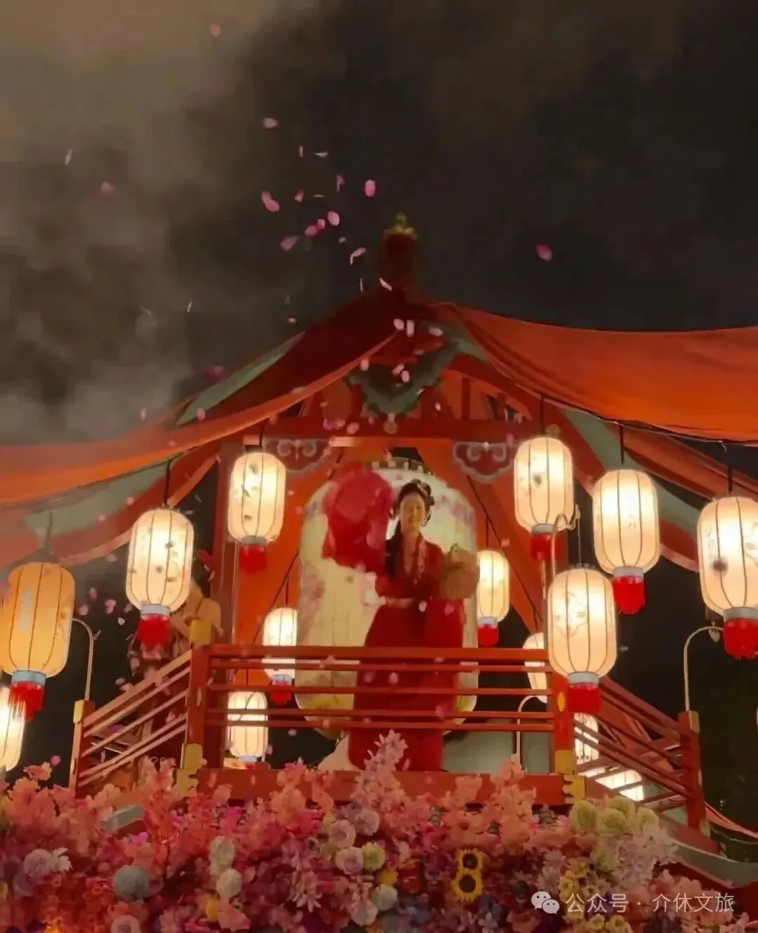 高颜值舞团全天候陪伴,日间身着非遗服饰巡游快闪,夜间化身光影使者,在主街阁楼上演激光舞蹈,让传统美学与科技感碰撞出别样火花。