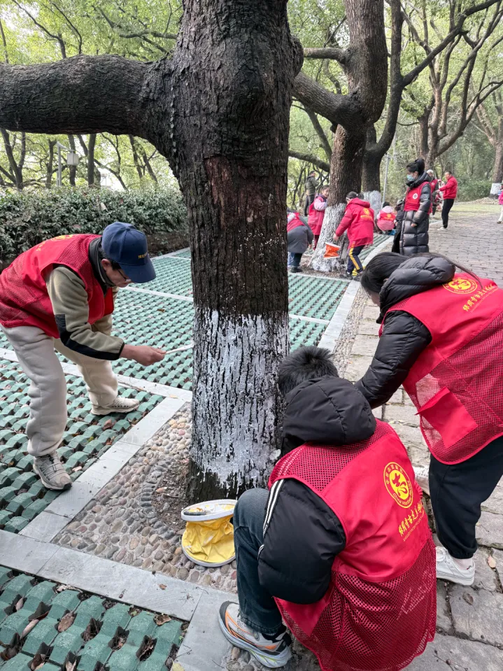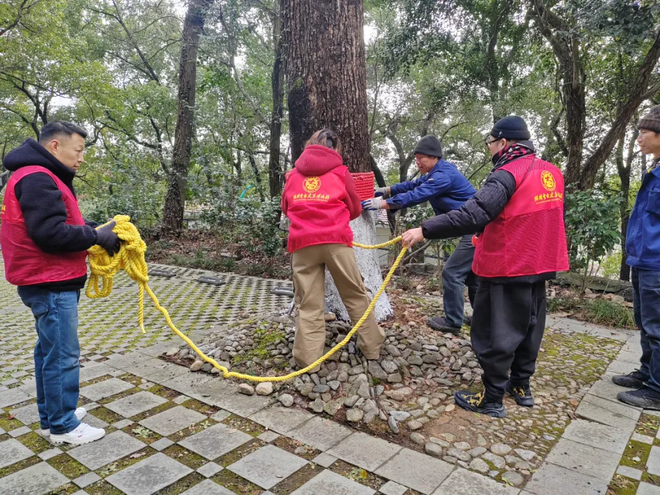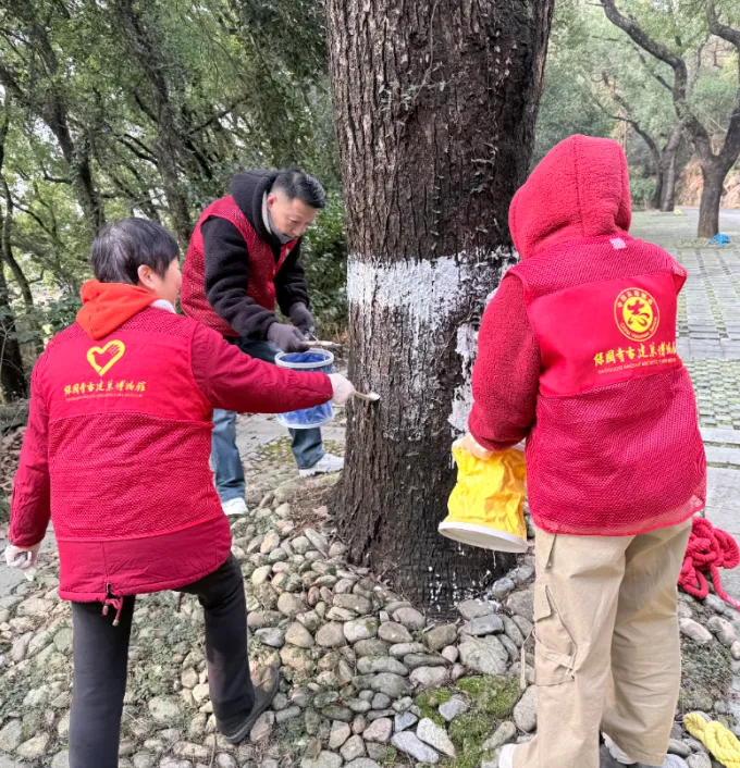 搅拌均匀的石灰浆被细心涂抹在树干基部,形成一层致密的“白衣”,既能杀菌杀虫,抵御越冬的真菌与害虫,又能反射阳光、避免树干冻裂。瞧!志愿者们熟练地缠绕着麻绳,借助麻绳的绝热特性保护导管免受冻害为树干裹上温暖的“冬衣”,每一个动作都饱含着对自然的敬畏与对国宝的珍视。这场护绿行动,正是“甬心”保国寺志愿文化服务队“我为‘国宝’护绿”四季志愿服务项目的生动延续,该项目已获评全省博物馆“十佳”志愿项目,多年来持续为景区的生态保护注入力量。
