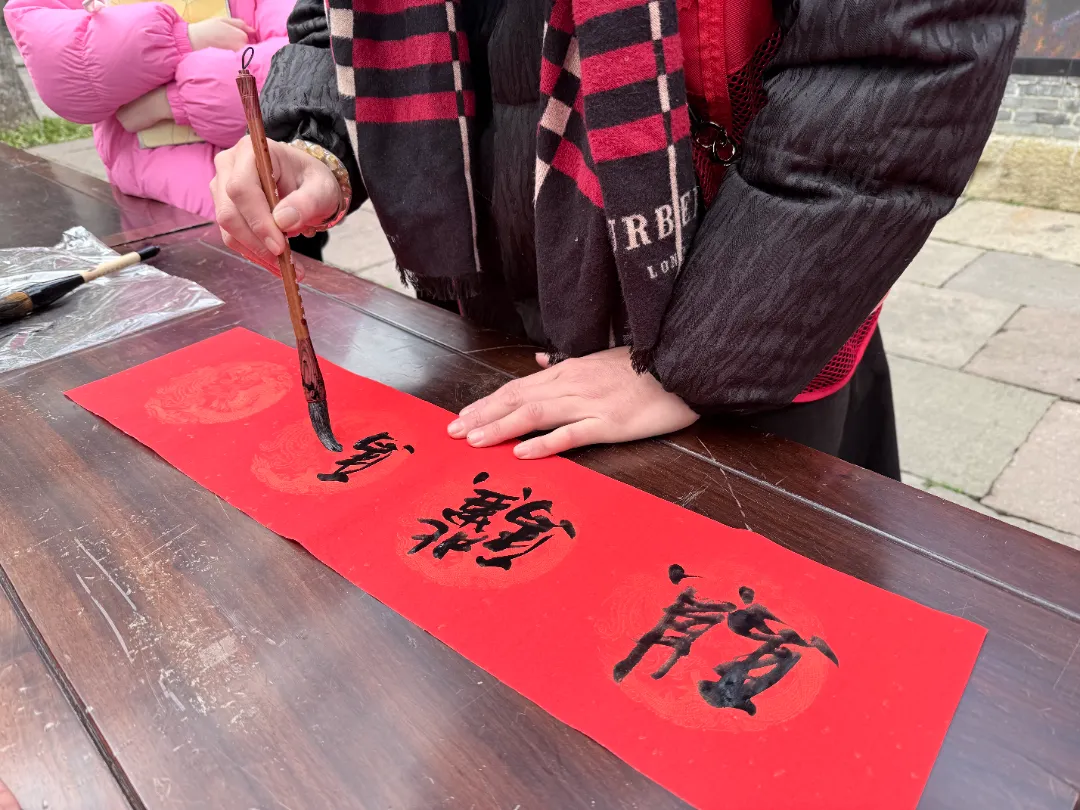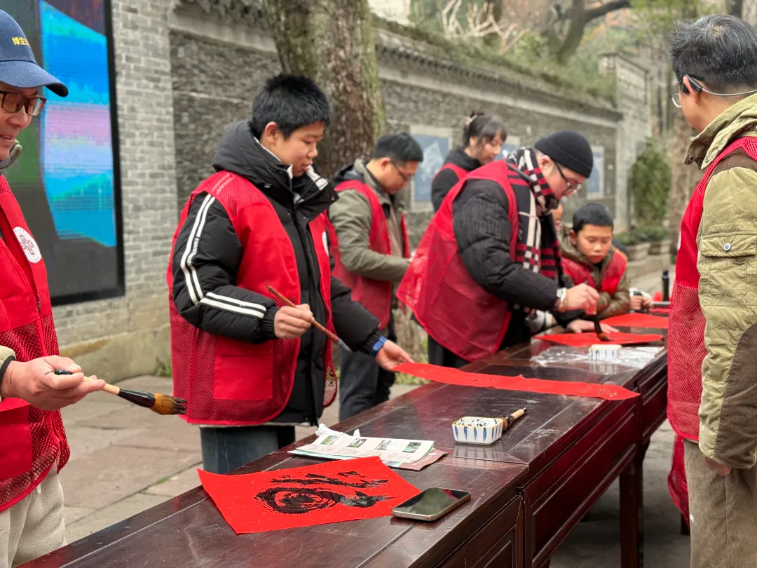 护绿行动结束后,志愿者们摆开笔墨纸砚,一场热闹的“翰墨送福”志愿活动正式开启。志愿者中既有书法爱好者,也有初学的新手,大家凝神挥毫,笔走龙蛇间,一个个饱满圆润的“福”字跃然纸上,或刚劲有力、或温婉灵动;一副副蕴含马年韵味的春联饱含深意,“马跃千山春正好,福临古建客盈门”“古建焕彩承文脉,绿林吐翠迎新春”,每一笔都凝聚着对新春的期盼,每一字都承载着对游客的祝福。