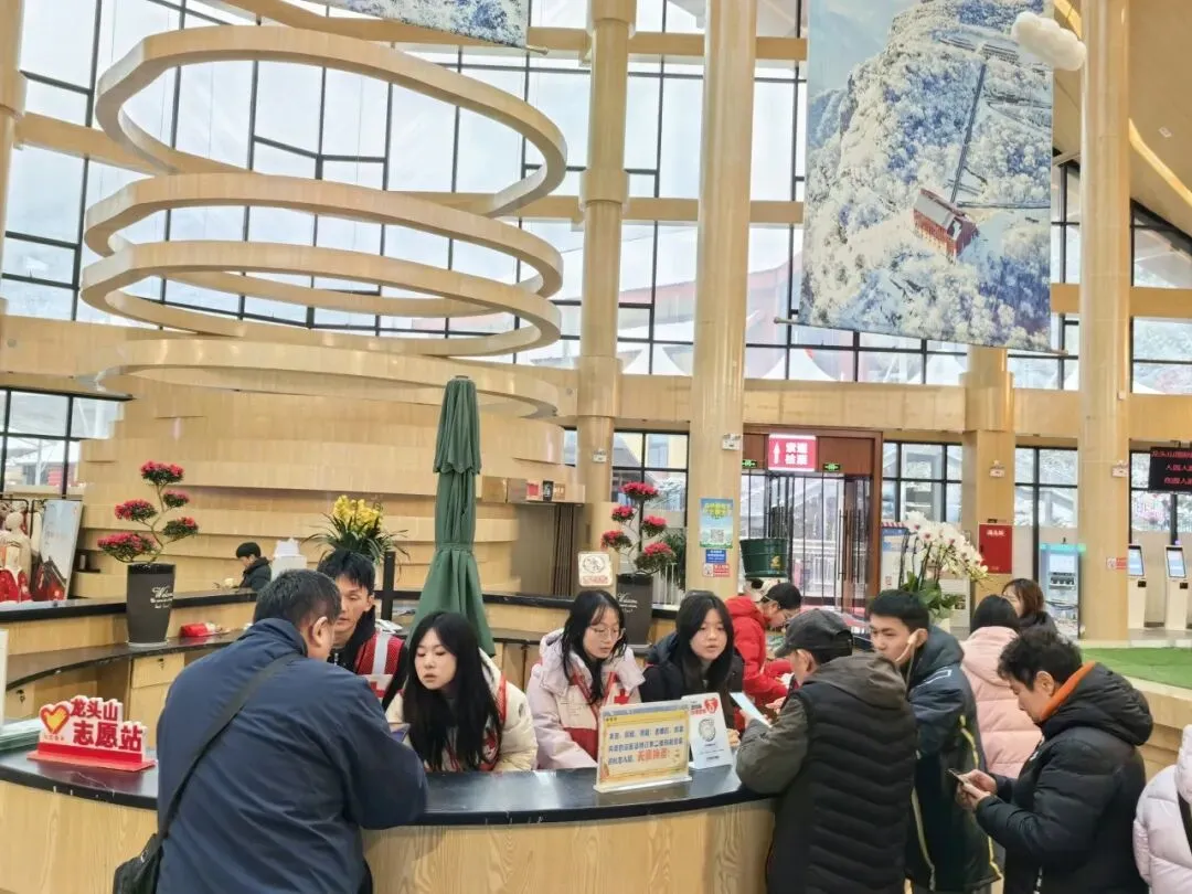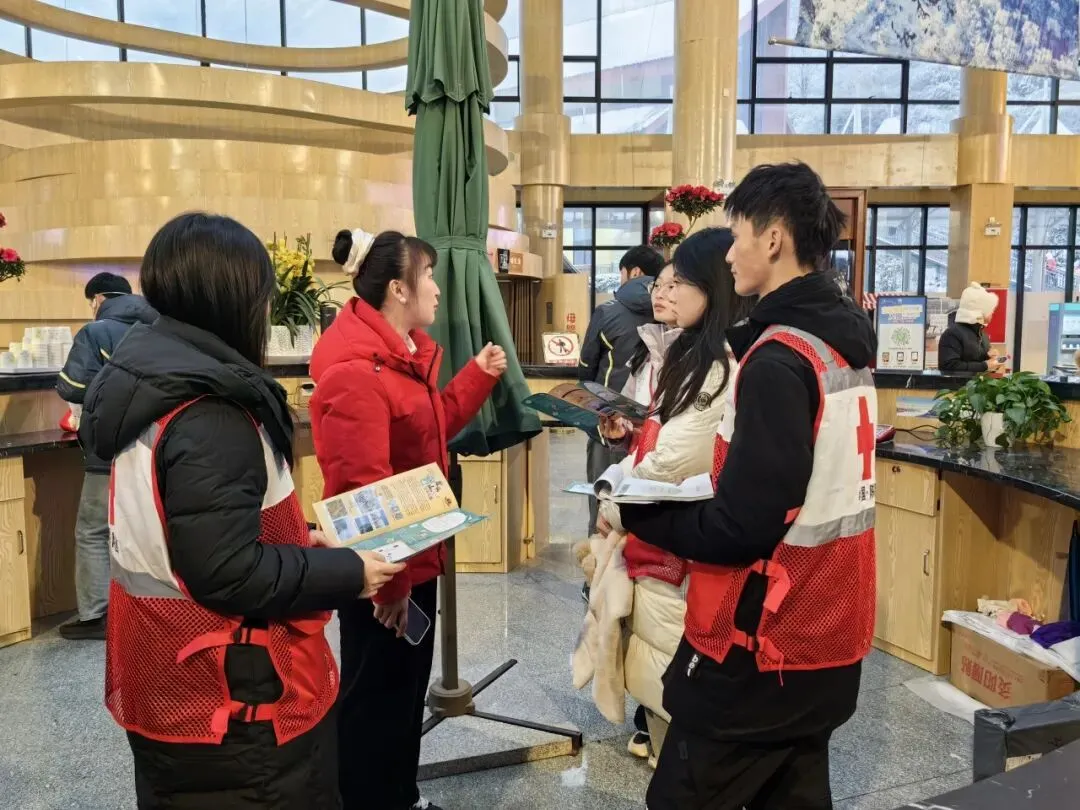 志愿者们全员坚守岗位,全方位保障景区有序运转:在景区入口,主动协助游客核验票务、扫码入园,耐心解答咨询,快速疏导入园人流;在索道站点,引导游客分区排队,提醒大家保管好随身物品、照顾好同行老人与孩童,有效避免拥挤踩踏风险;在咨询点引导游客时,遇到一名游客突发疾病,红十字志愿者第一时间上前评估状况,协助景区工作人员将游客平稳转运至山下就医,以细致的服务让游客安心畅享冰雪乐趣。