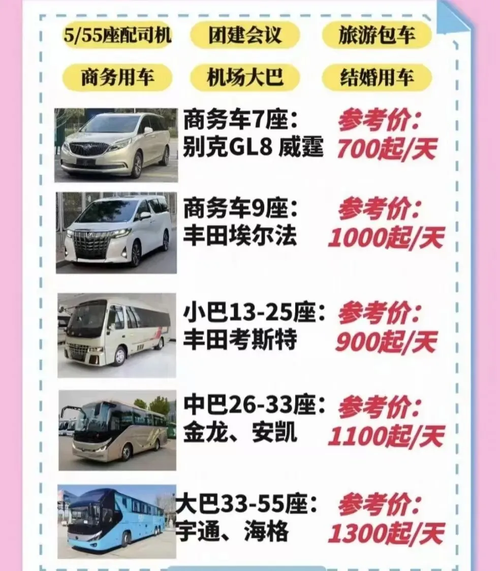 ⚠️注意:以上报价仅为市区用车参考价格,郊区跨市跨省长途用车、多日包车、提供豪华车型及增值服务价格不同!别被低价套路了