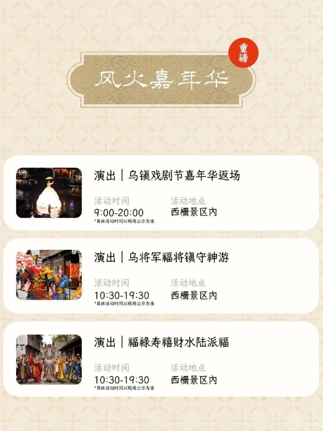 活动期间,风火嘉年华、魅影乌镇、水陆年市、新春长街宴、诸神贺岁、向往的生活 乌镇蘑菇屋、无量贪杯 新春大集、乌镇早茶客、冬日奇趣暖聚乌村九大板块,每日将轮番呈现四大主题活动、五大主题光影、十余场巡游以及二十余场演出。