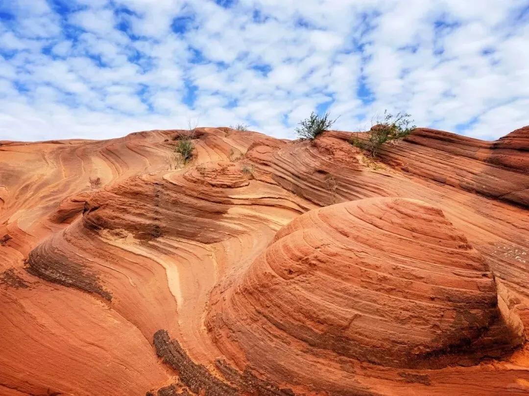 红砂岩风蚀成浪纹,陕北丹霞的时光印记。 |
