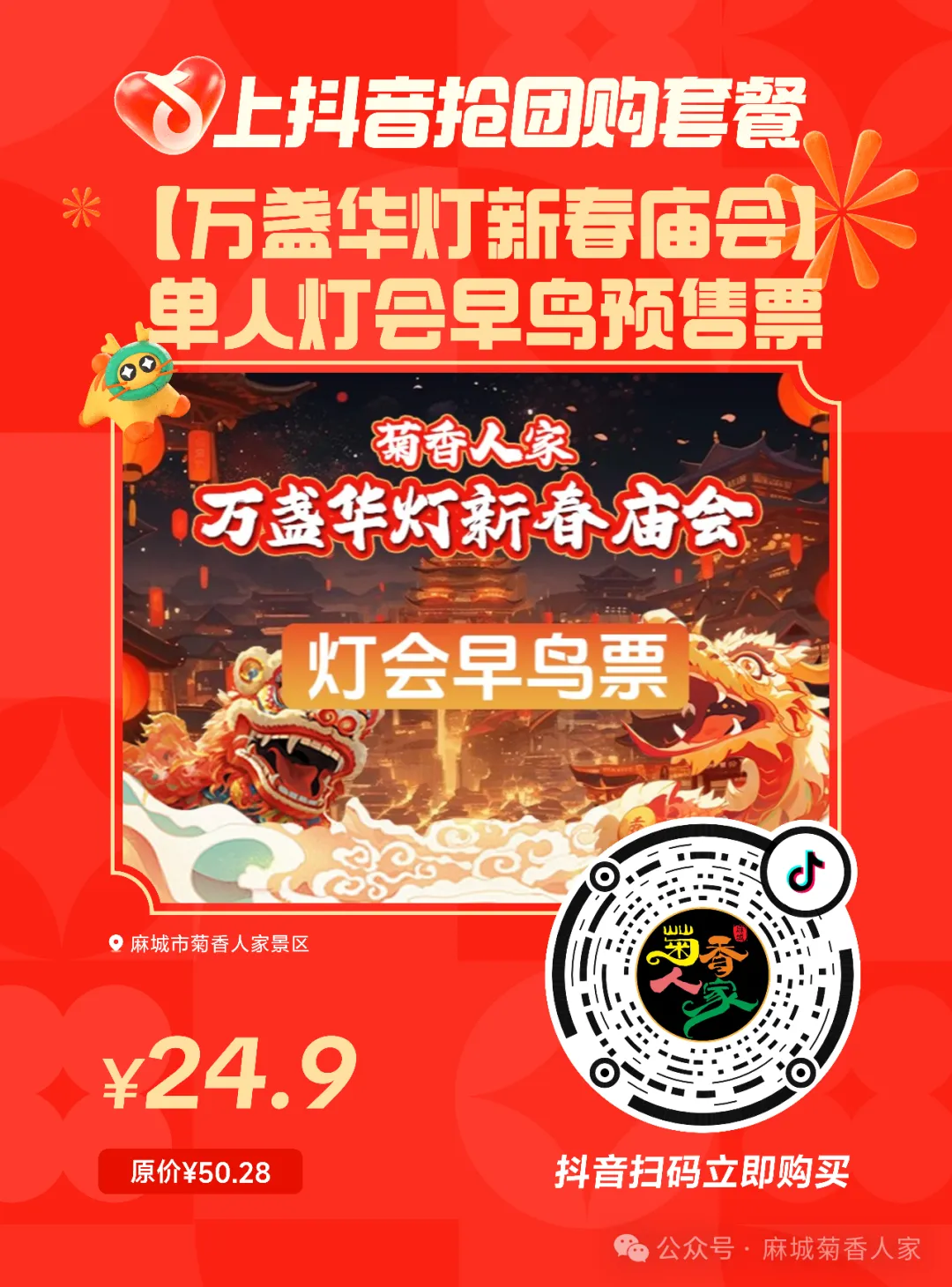 2026马年新春,菊香人家万盏华灯齐绽放,繁花似锦竞相绽放,春色满园年味浓!龙马呈祥门楼气势恢宏,飞鱼灯长廊流光溢彩,花船巡游载月而行,蘑菇丛林、仙灵花径、田园牧歌等主题灯组步步皆景。除了观灯赏花,还可以观看非遗表演、火秀杂技。孩子们则可以在无动力乐园尽情玩耍,全家人在新春市集品尝麻城特色小吃,选购手工艺品,度过温馨浪漫的夜晚。抖音团购早鸟票已开售,欢迎下单。