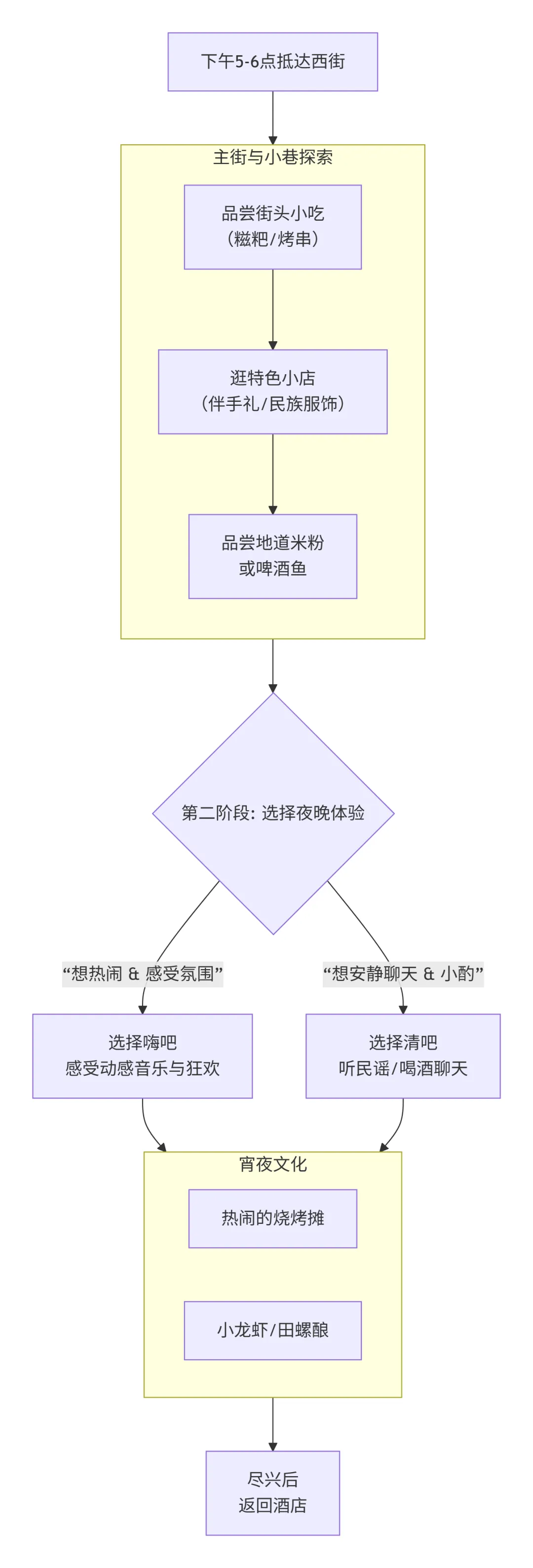 调整正确预期:西街不是古朴的古镇,而是一个极度商业化、充满活力的“旅游集市”和“酒吧街”。它的魅力在于喧嚣、热闹和国际化氛围,是白天游玩后晚上放松的据点。