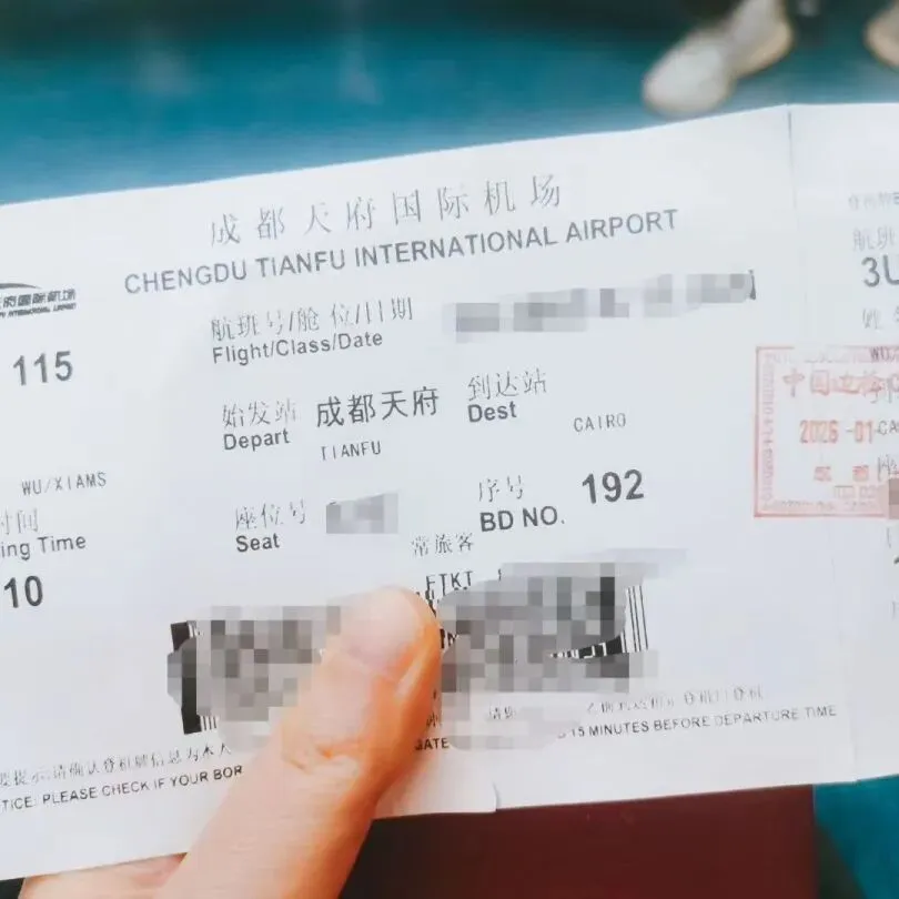 乘坐四川航空3U3863航班从成都飞往开罗,飞行时间约11小时,抵达开罗国际机场。