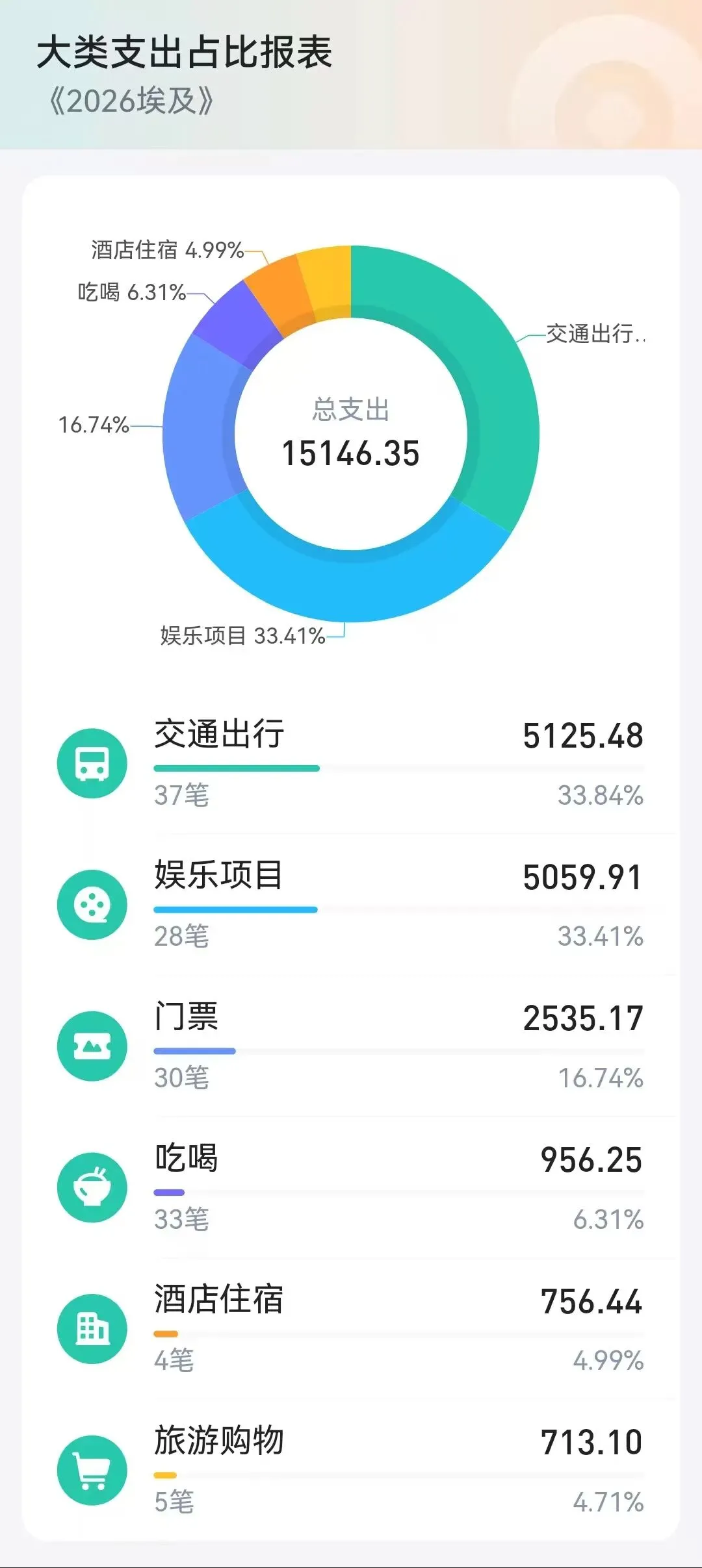 本次18天埃及全景之旅,全程自由行,覆盖开罗、阿斯旺、卢克索、亚历山大与黑白沙漠等核心目的地,体验了金字塔、神庙、尼罗河邮轮、热气球与沙漠露营等丰富内容。令人惊喜的是,全程包含机票、住宿、交通、门票及主要餐饮,总花费控制在了人民币1.5万元以内;即便加上各类纪念品与手信,总支出也仅在1.5万元出头,可谓性价比极高的深度之旅。