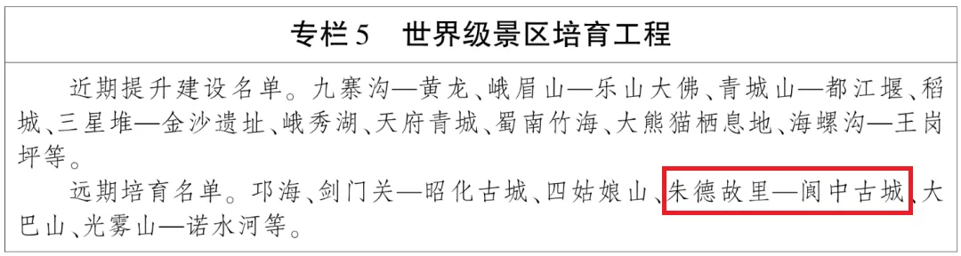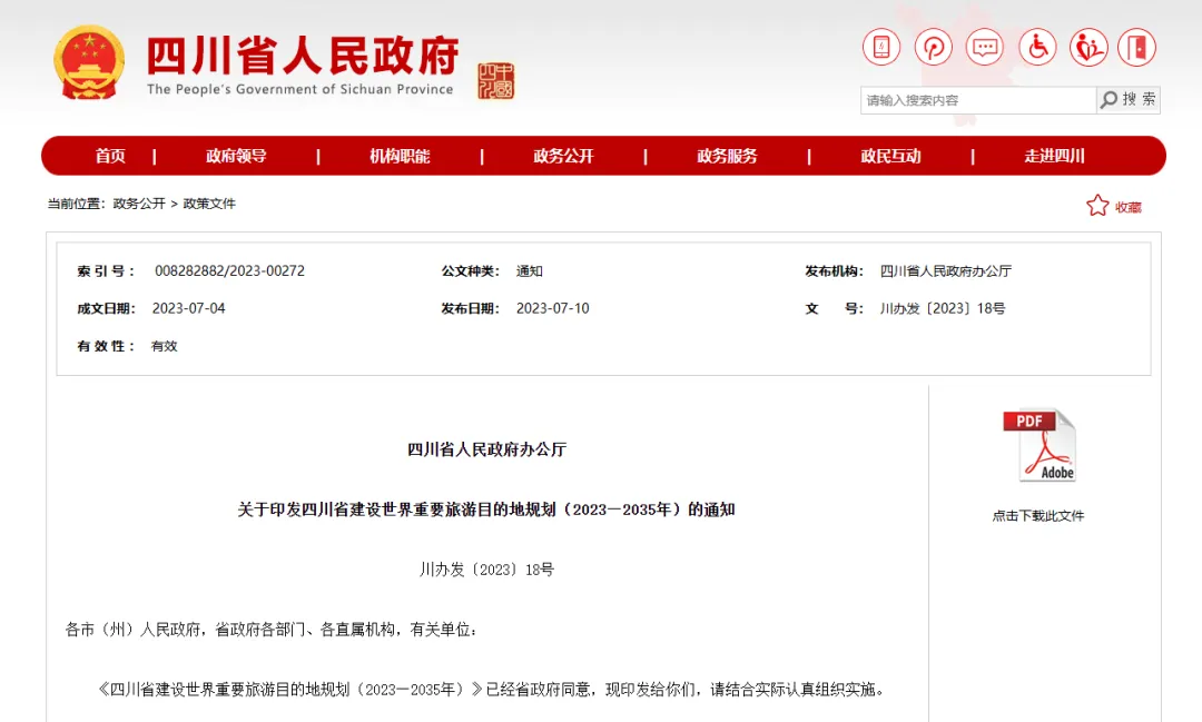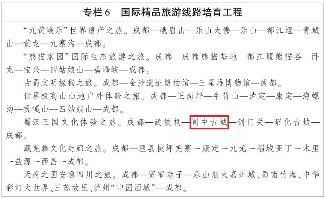 >>推出世界级旅游线路产品,适应国际游客需求,将串联大九寨、大峨眉、大贡嘎、大香格里拉、大遗址5大区域世界遗产、世界级文化旅游产品,支撑长征、黄河、长江国家文化公园四川段和大熊猫国家公园等高质量建设,推出7条国际精品旅游线路。
