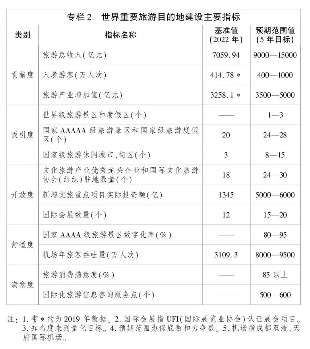 助力四川文旅走向世界,《规划》还提出5年建设目标:未来5年,四川旅游总收入达9000至15000亿元,世界级旅游景区和度假区达1至3个,国际会展数量达15至20个,旅游消费满意度85%以上。具体指标如下: