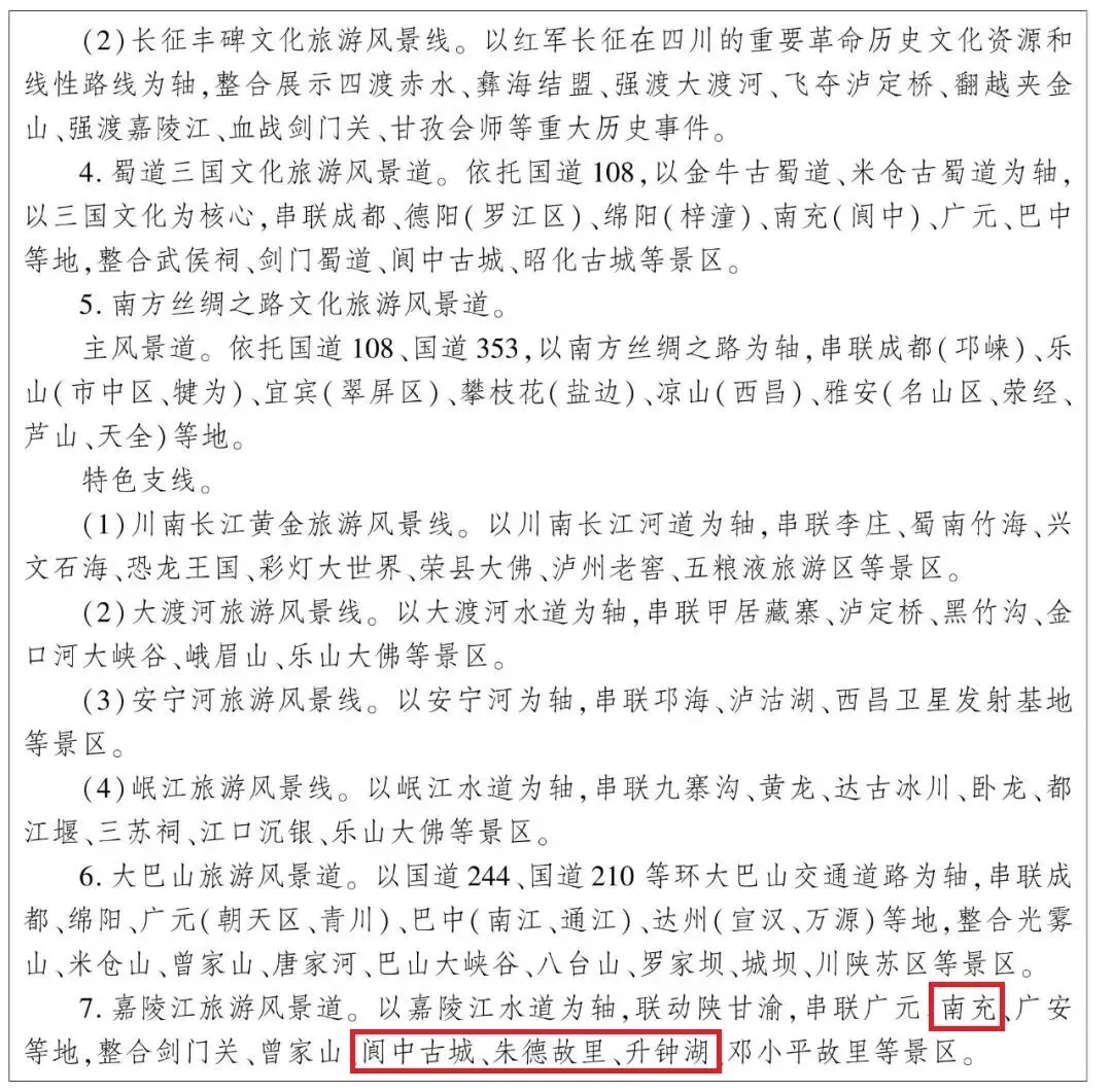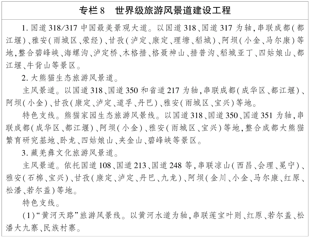七道串联:在“四廊”加快建设基础上,重点培育大熊猫生态旅游风景道、藏羌彝文化旅游风景道、国道318/317中国最美景观大道、蜀道三国文化旅游风景道、南方丝绸之路文化旅游风景道、大巴山旅游风景道、嘉陵江旅游风景道等7条世界级旅游风景道。