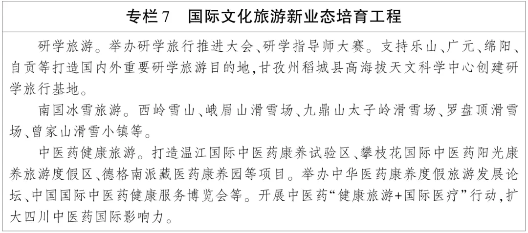 根据《规划》,将围绕四川特色优势文化旅游资源,打造世界级旅游名城、景区、度假区、风景道和线路产品,培育具有国际引领性的新业态,不断提升四川资源、旅游产品和新业态吸引力。