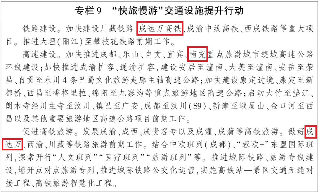 在构建“快旅慢游”交通网络方面,将加快建设乐山、阆中机场,逐步开通康定机场至长三角、珠三角、京津冀等地区航线,加密九寨黄龙机场、稻城亚丁机场至北上广等主要入境口岸的航班。重点优化连通成都、乐山、南充、 宜宾、泸州等地与京津冀、长三角、粤港澳大湾区8小时以及西安、重庆等周边省会城市高铁的开行班次。构建覆盖国内主要城市的“1至8小时”高铁旅游圈。