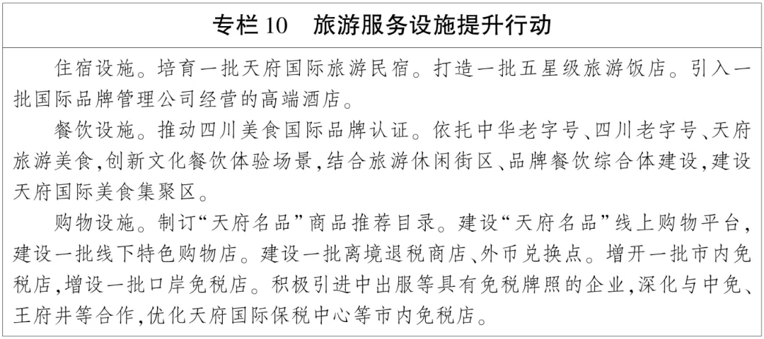 建设国际一流的购物设施。建设布局合理的巴蜀旅游购物设施。深化天府旅游名品建设,引导川字号企业布局国际文旅特色商品,围绕川菜、川酒、川竹、川茶、川灯、川剧、川盐等开发系列文创产品,在国际市场叫响“川字号”特色品牌。支持成都市争创市内免税店试点城市,推动设立市内免税店,支持和推进跨境贸易项目建设。