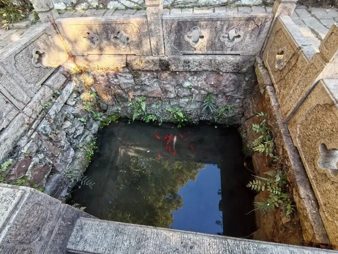 南北两侧各有一方正方石池,游人从中间石板穿行而过。池中几尾锦鲤悠游其间,清浅池水映着祠内木柱黛瓦,这是旧时祠堂的泮池,既能蓄水防火,亦是祠堂礼制的象征,藏着江南文人独有的亲水雅致。