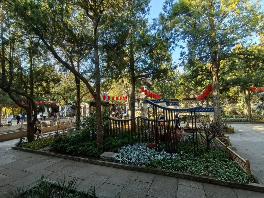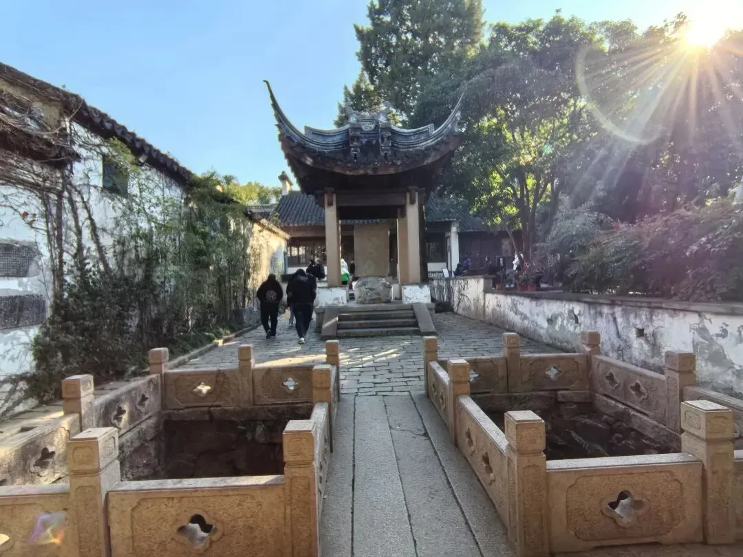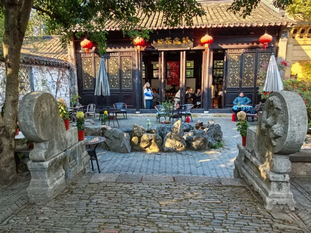 跨进古华山门,东西走向的直街直通惠山寺。左侧街旁,石牌坊立在巷口,锦堂茶坊与云林茶社并肩而居。前者由南宋张明公祠改建,后者为元代倪云林先生祠所成,两祠跨朝相依,古意相融。朴素石纹里,藏着穿越千年的文人韵味。