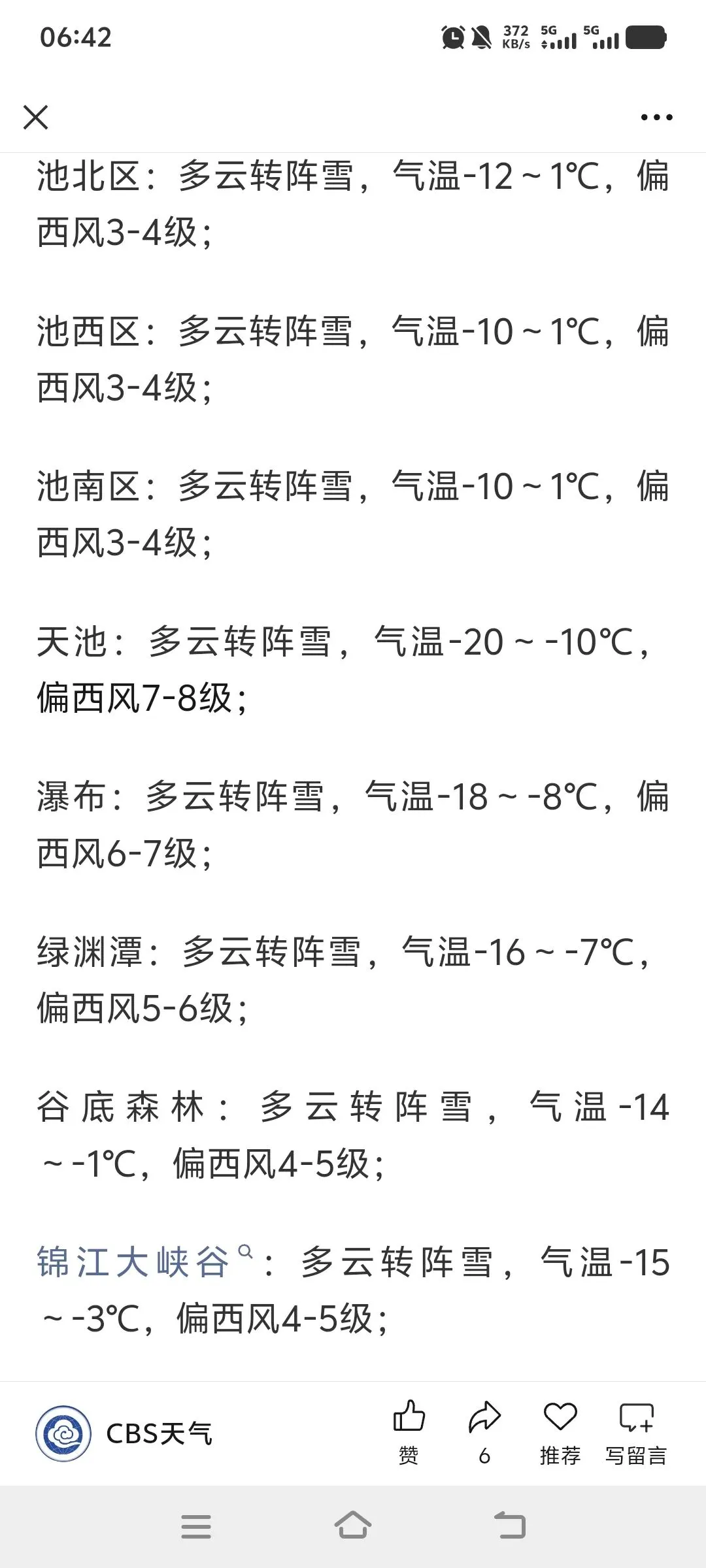 ➡️北景区天池主峰,风力较大,公路、栈道积雪,不具备安全运营条件,天池景点全天关闭。其他景点正常开放,视天气情况随时关闭。 ➡️西景区主峰,风力较大,公路积雪,不具备安全运营条件,天池景点全天关闭。粉雪谷、锦江大峡谷景点,正常开放,视天气情况随时关闭。 ➡️南景区关闭。