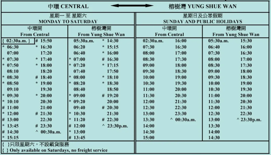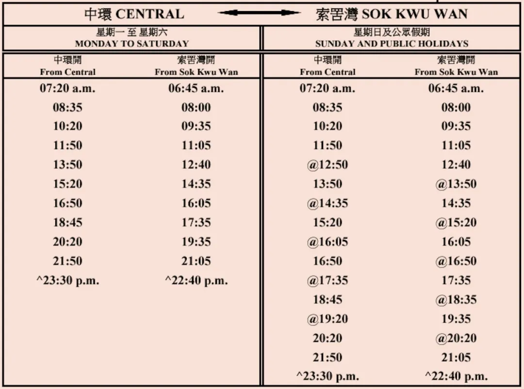 中环来往索罟湾时间表(港九小轮)