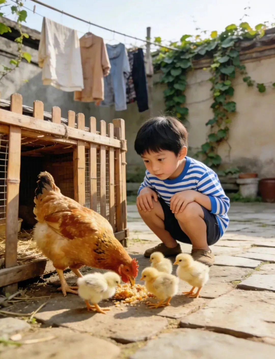我曾经带儿子回乡下老家,他第一次看见母鸡孵蛋,兴奋得守在鸡窝旁不肯走。