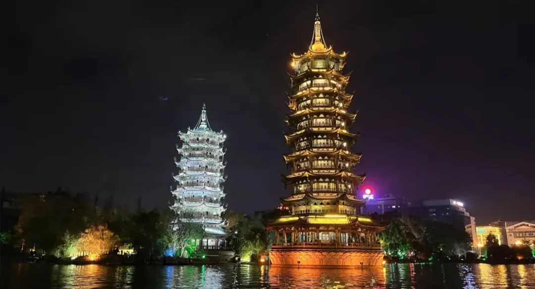 桂林“两江四湖”,即指漓江、桃花江、木龙湖(含铁佛塘)、桂湖、榕湖、杉湖。该工程最早形成于北宋年间(960-1127年),当时榕湖、杉湖、桂湖上舟楫纵横,游人如织,兴盛一时。两江四湖构成桂林山水美景的重要组成部分。如今,桂林两江四湖环城水系重现昔日兴盛,形成了一条与威尼斯媲美的环城水系,堪称中国一绝。特别是在夜间游览,灯光映衬下彰显出五彩缤纷、梦幻绝伦、无限遐想的高雅意境。