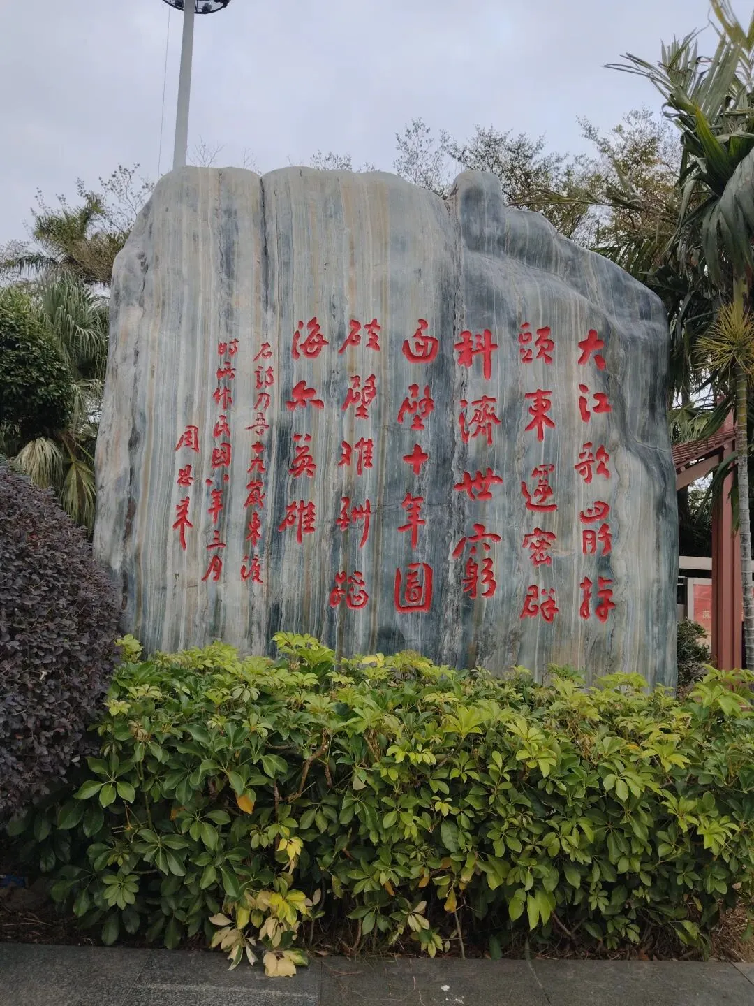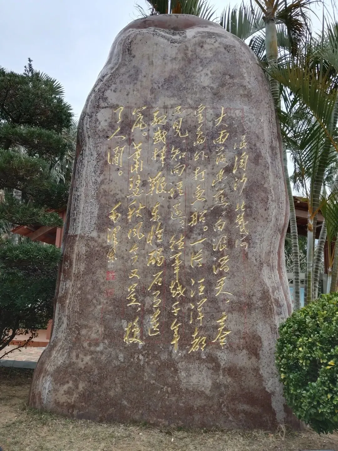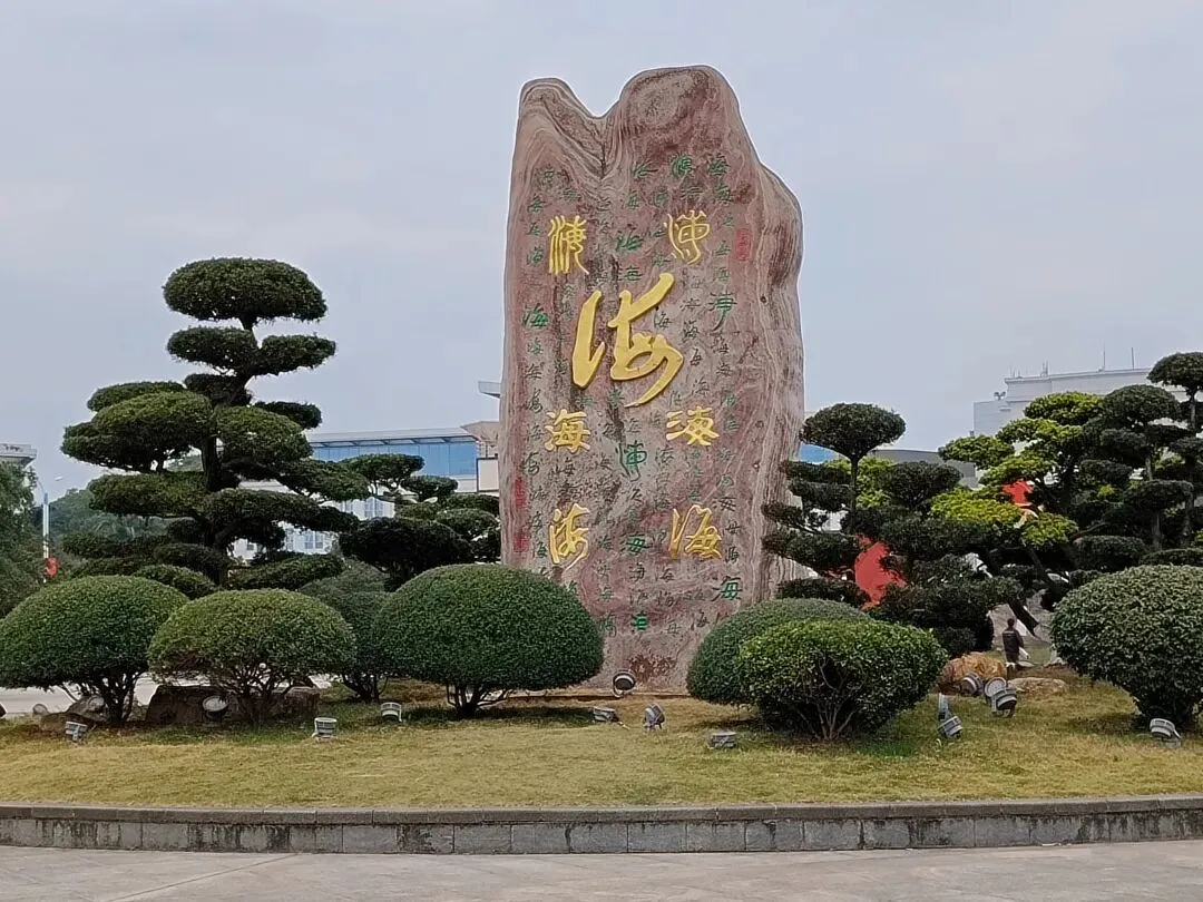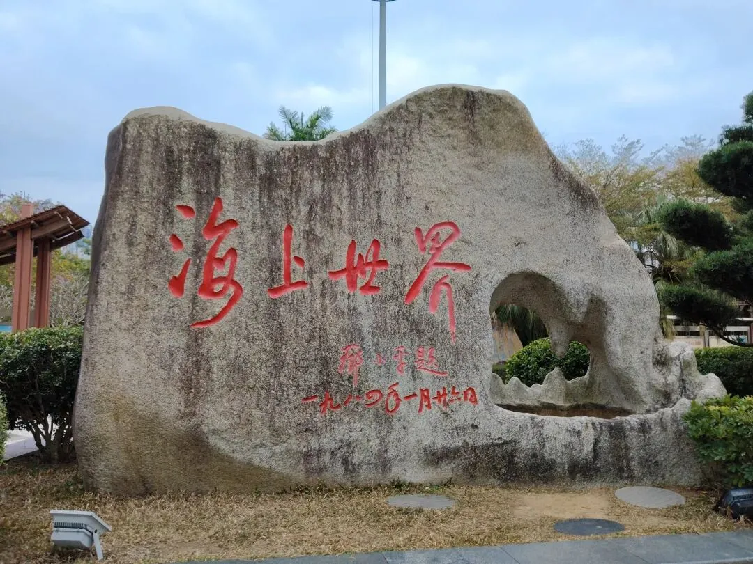 公园里散落着许多天然景观石,上面镌刻着历代书法名家以海洋为主题的作品。最引人注目的是那幅《百海图》,据说汇集了从王羲之、颜真卿到毛泽东、邓小平等一百位古今名人所书的“海”字,颇为壮观。
