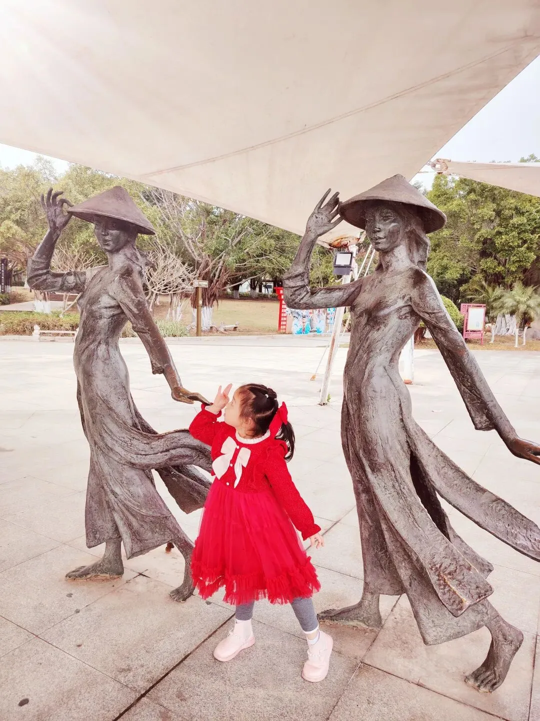 人工湖的西侧,还有京族舞蹈、独弦琴等展现当地民俗风情的雕塑。