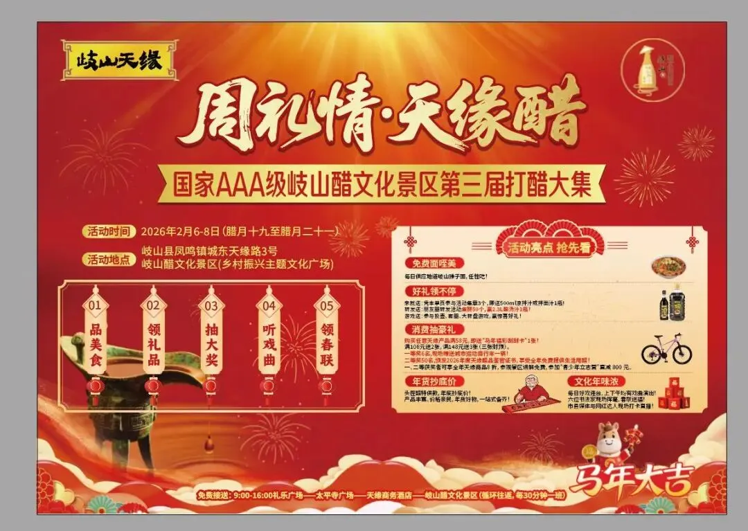 根据岐山天缘官方微信平台发布的最新消息,在中共岐山县委文明办、岐山县文化和旅游局、岐山县农业农村局和岐山县商务局等单位的联合指导下,岐山县国家AAA级岐山醋文化景区将于2026年2月6日-8日在凤鸣镇八角庙村“村企联建-乡村振兴主题文化广场”举办第三届打醋大集系列活动。此次活动的主题为:“周礼情.天缘醋”。旨在通过从“产品到企业,从企业到产业”的角度,立体展示和呈现岐山县“做大一碗面”战略落地的成果,让发展的成果惠及百姓民生,共同营造“欢欢喜喜过大年”良好的节日氛围。