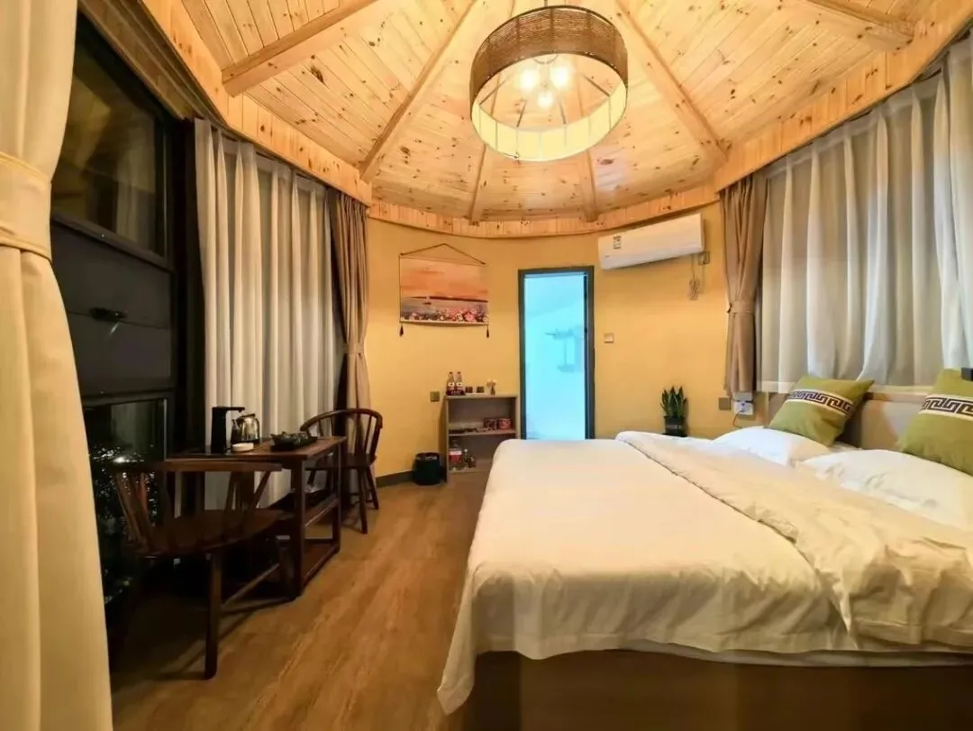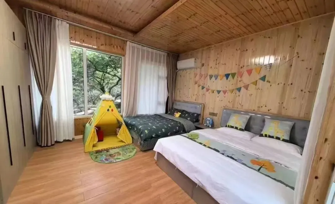 ▲静心居 ▲清心居 ▲爽心居 ▲养心居 ▲逸心居 ▲竹荫居 竹泉村竹荫别院隐匿于山水竹林之间,以“景村融合”为定位,在对传统古村落保护的基础上,将景区天然的竹林、泉水,地方文化、传统街区有机结合,游客不仅可以享受到高档住宿服务,更能体验“静悟竹影摇曳,隔墙聆听清泉”的优美意境。 民宿房间设计主要以家庭、亲子设计为主,同时配有大床房、双床房、亲子房、家庭房、情侣房等不同房型,屋内有旋转滑梯、榻榻米、小帐篷,院子里有秋千、休闲桌椅和各式小水景,竹林掩映下的石墙灰瓦和石板小路,透着舒适惬意的民宿时光。各房间共享开阔公共休闲空间的同时,又独立恬静,各有意境。 栗水山居以原有地貌为基,以毛草团瓢为外部建筑主题风格,与自然相融,建设精品民宿7栋,所有房间都是超大景观的落地窗,在房间里便可静观日照挑峪山,月落香山湖,是一处集休闲、娱乐、度假、生活居住、露营、餐饮、采摘和养生为一体,独具沂蒙特色的休闲民宿。 民宿充分发挥自然生态优势,将“春日栗花盛开香气四溢、夏季林下避暑舒适惬意、秋季观景赏叶自在悠然、冬季围炉煮茶尽显意境”设为四季主题,根据季节不同让游客拥有多种不同体验。 远方的家民宿 乡约民宿 铜井镇乡约民宿主体为二层小洋楼,私家小院隐秘感较强。屋内共6间客房,房型有大床房、亲子房等,房屋装修简约却不失格调。其中一楼客厅采光极好,落地窗让阳光洒满整个房间。餐厅和厨房设备齐全,适合多人聚餐;二楼宽敞的办公会客厅适合小型会议;顶楼阳光草坪白天可以享受太阳浴,晚上则是聊天、喝酒、看星星的好地方。民宿内设施齐全,有投影仪和麻将等娱乐设施,可满足游客的日常需求。