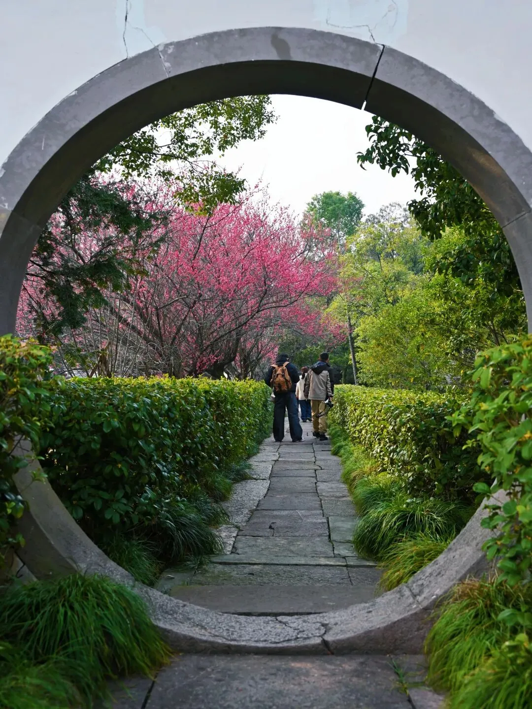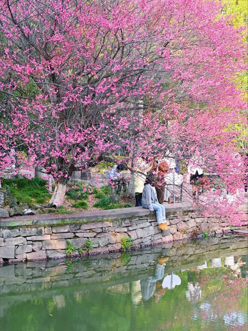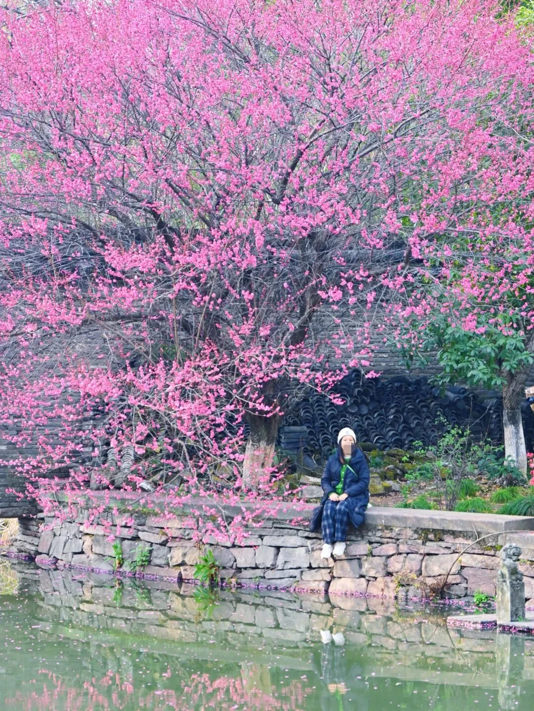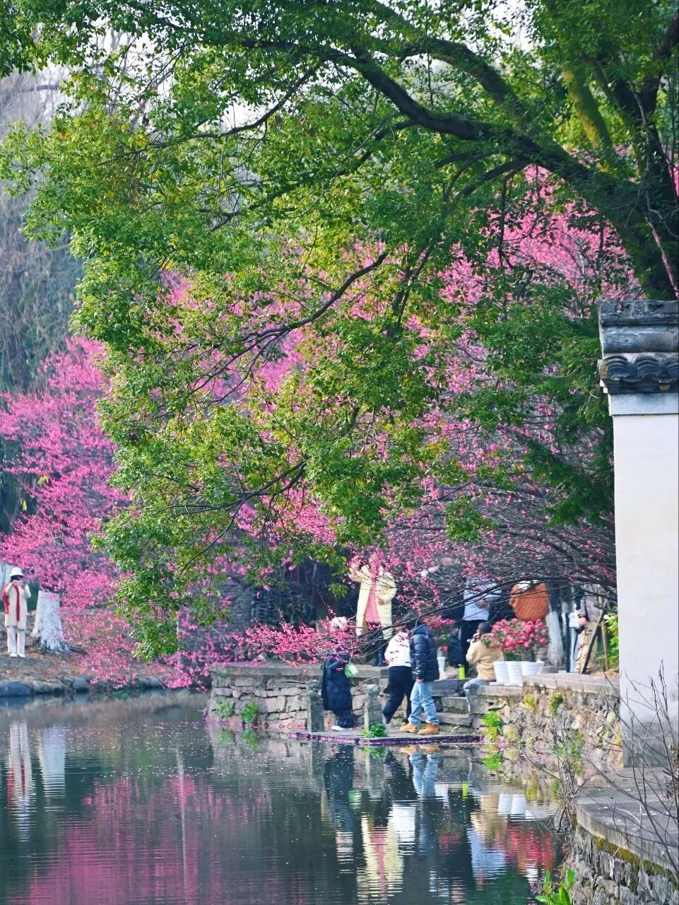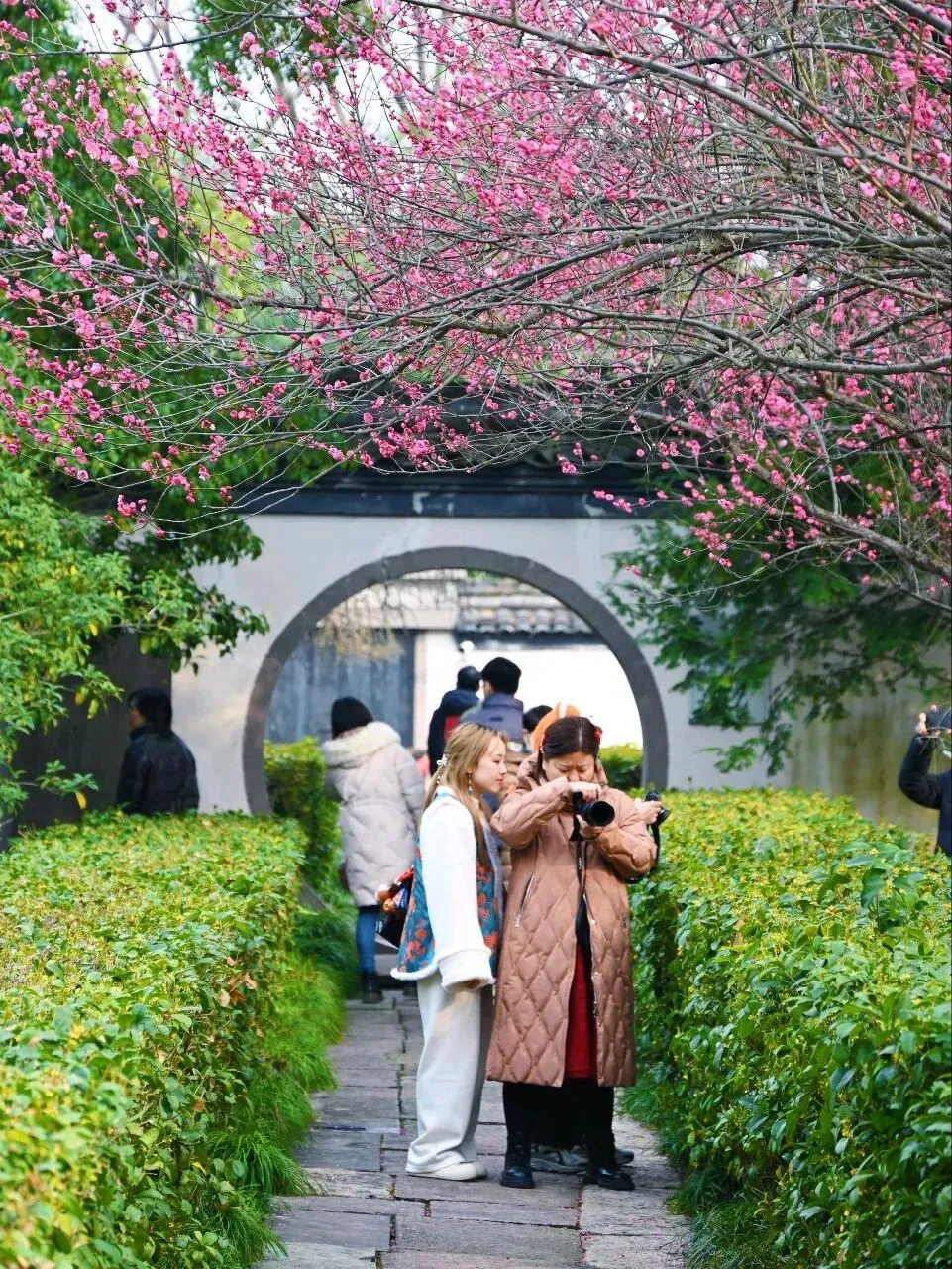 从东侧小桥上望过去,梅花与青瓦白墙的古建筑相映成趣。一树粉红依偎着沧桑的墙面,强烈的色彩对比却有着奇异的和谐。几个穿着汉服的姑娘在花下拍照,她们轻摆裙裾,笑语嫣然,人与花构成一幅活生生的仕女赏梅图。