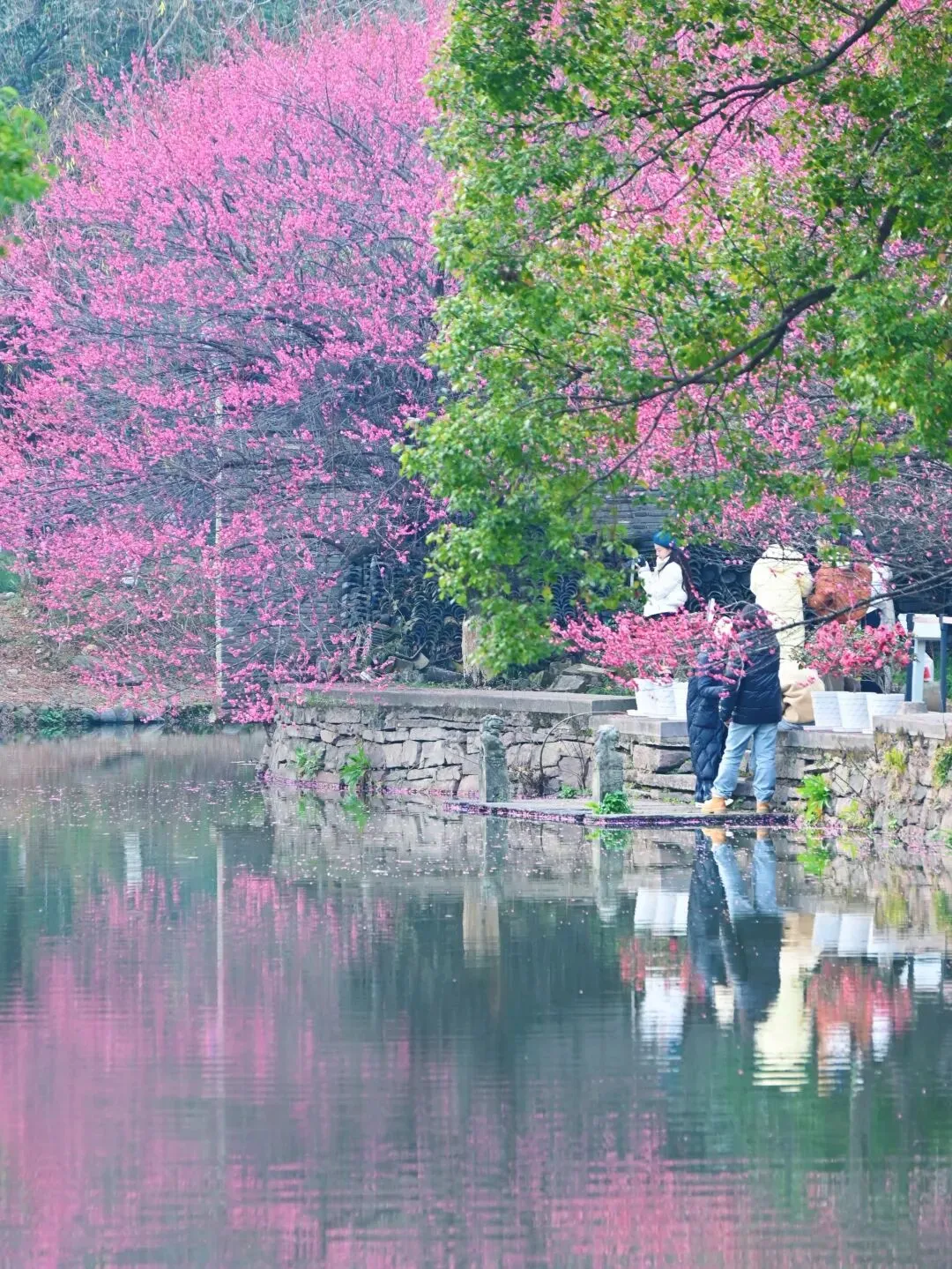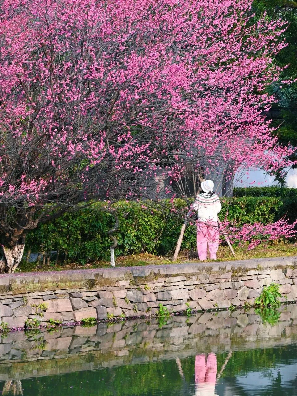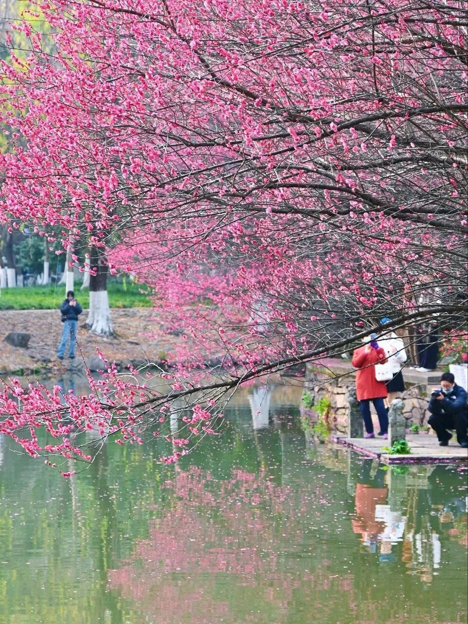沿着河边慢慢走,从不同位置、不同角度欣赏这片梅花,每一次驻足,都是一幅不同的江南画卷。